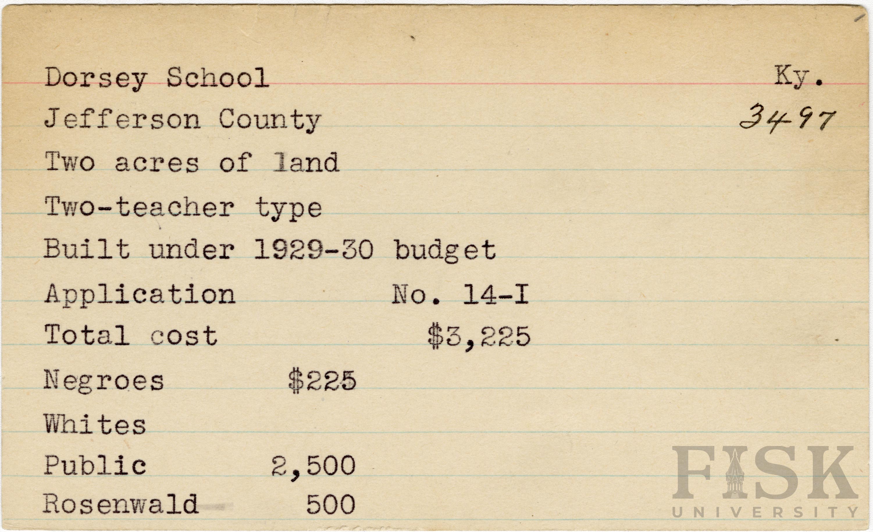 - School card from Rosenwald Fund for Dorsey School in Jefferson County, Kentucky