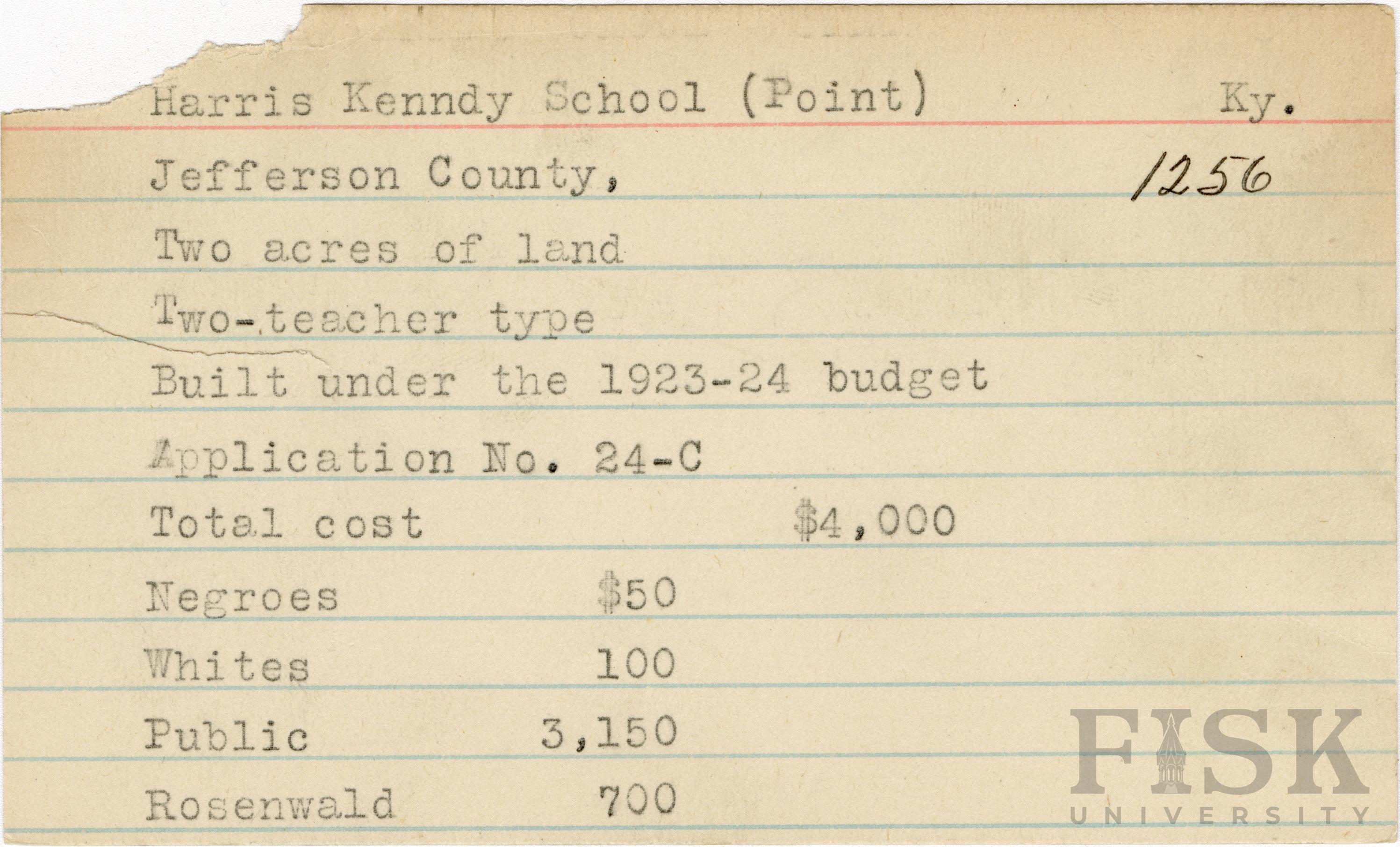 - School card from Rosenwald Fund for Harris Kenndy School in Jefferson County, Kentucky