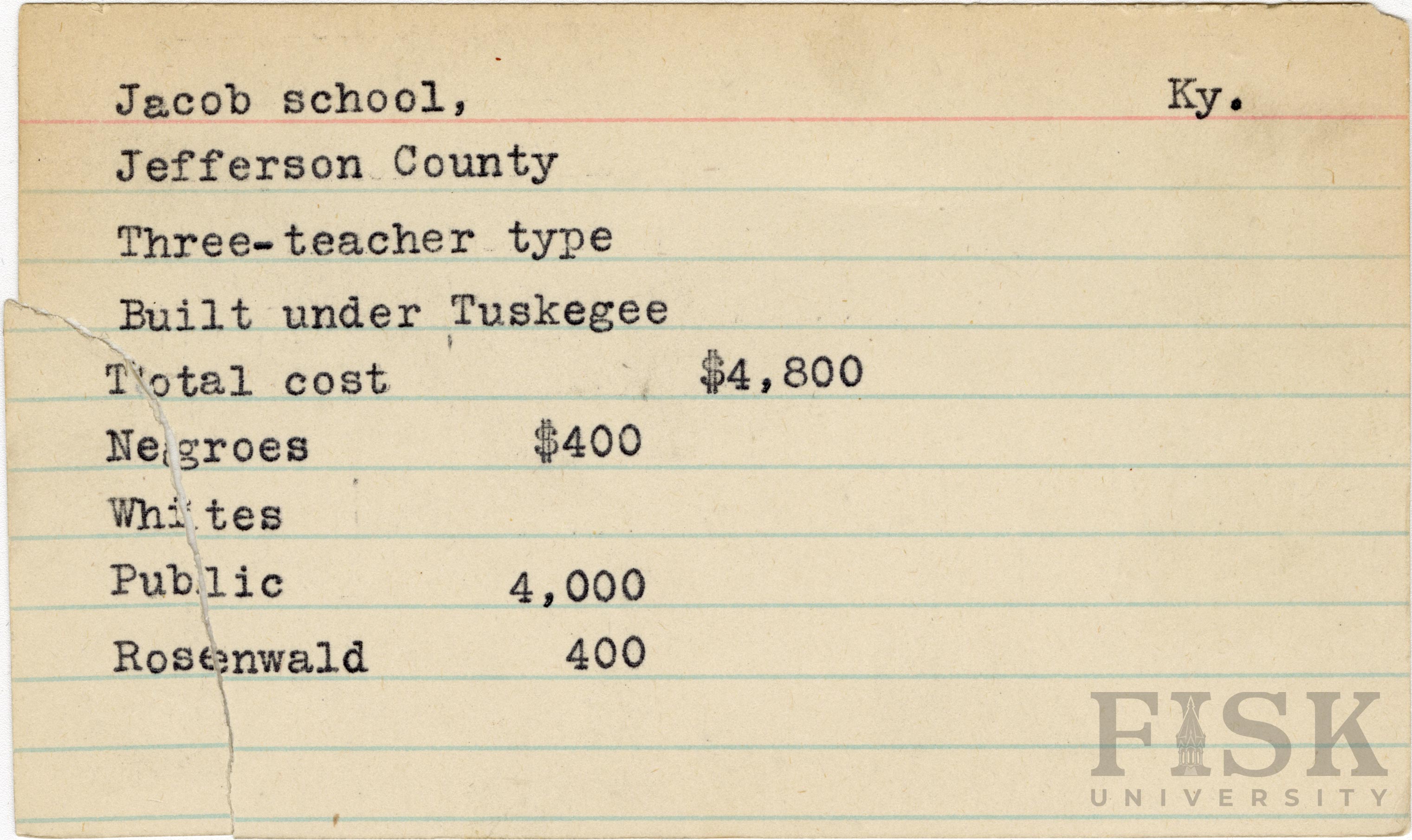 - School card from Rosenwald Fund for Jacob School in Jefferson County, Kentucky