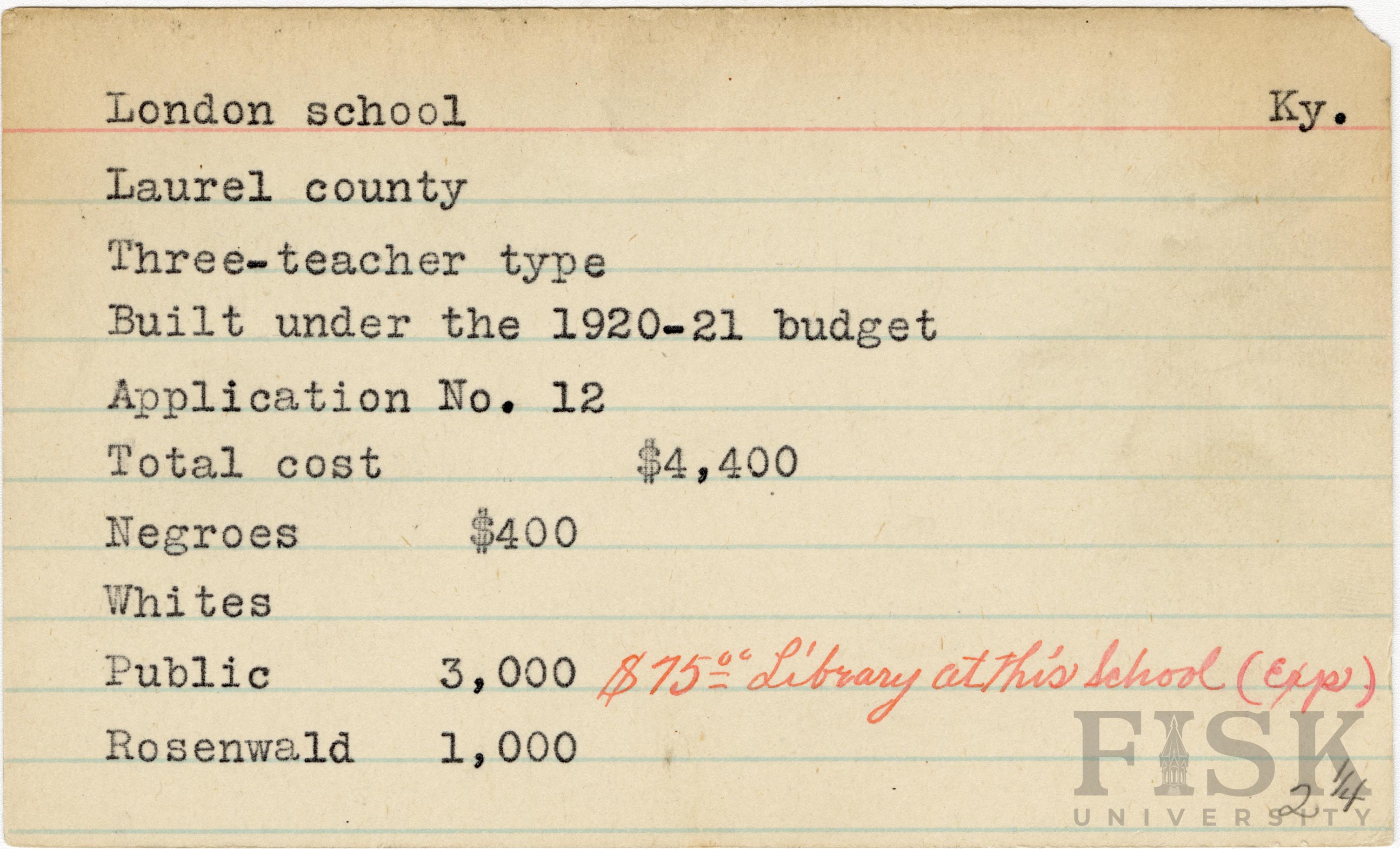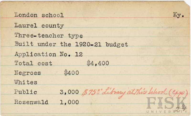 - School card from Rosenwald Fund for London School in Laurel County, Kentucky with a handwritten note that says, "$75.00 library at this school (Exp)"