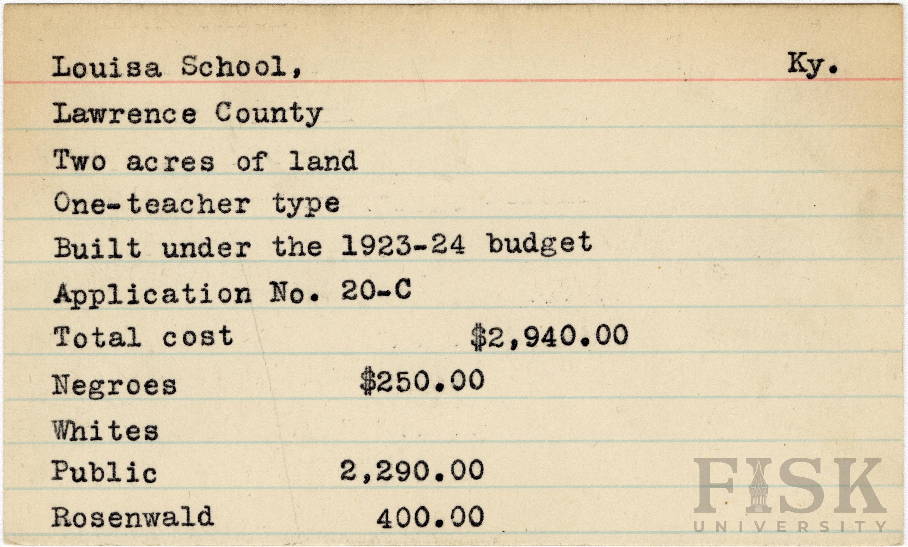 - School card from Rosenwald Fund for Louisa School in Lawrence County, Kentucky