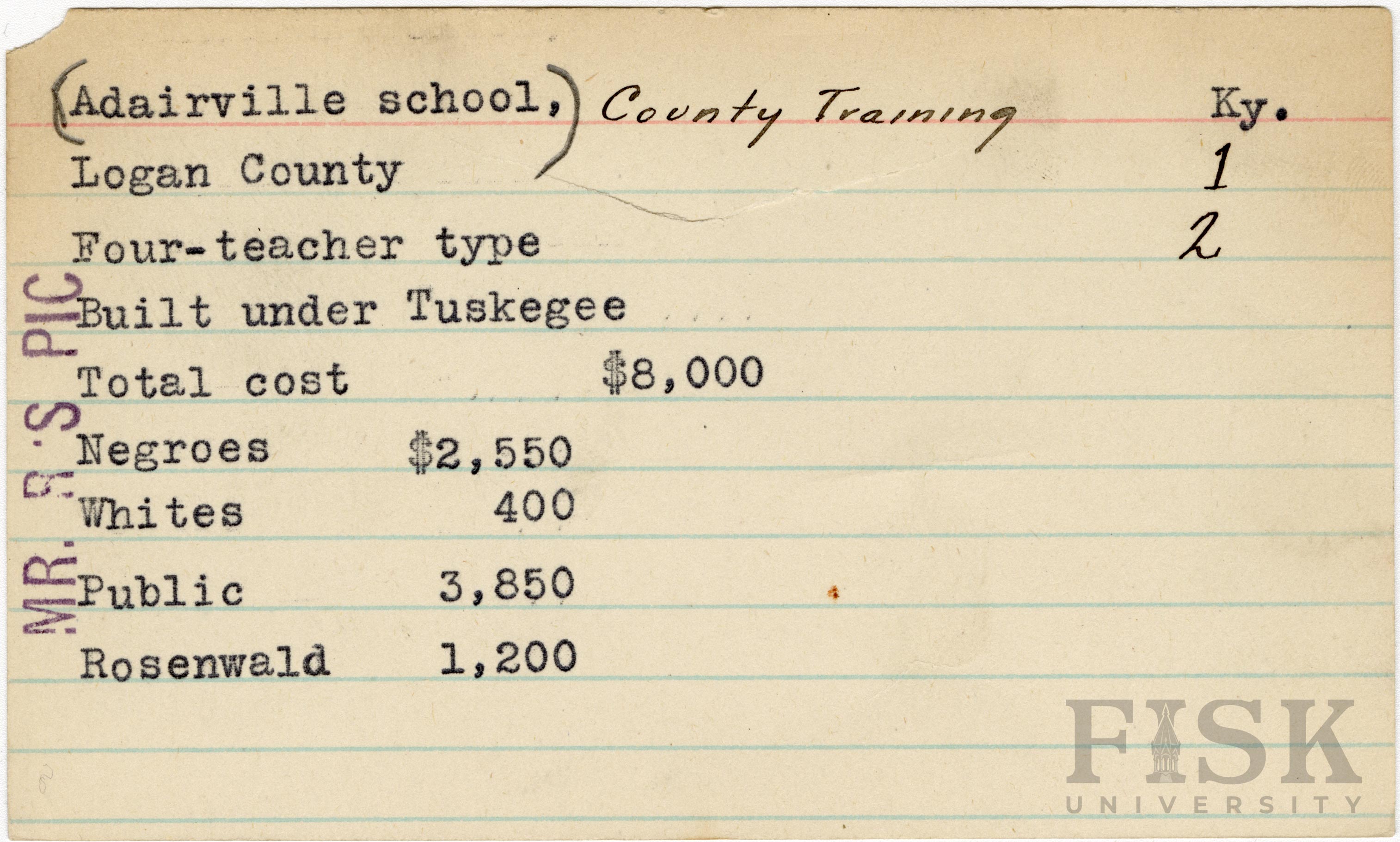 School card from Rosenwald Fund for Adairville School in Logan County, Kentucky with a note on the far left of the card that says, "Mr. R's Pic"