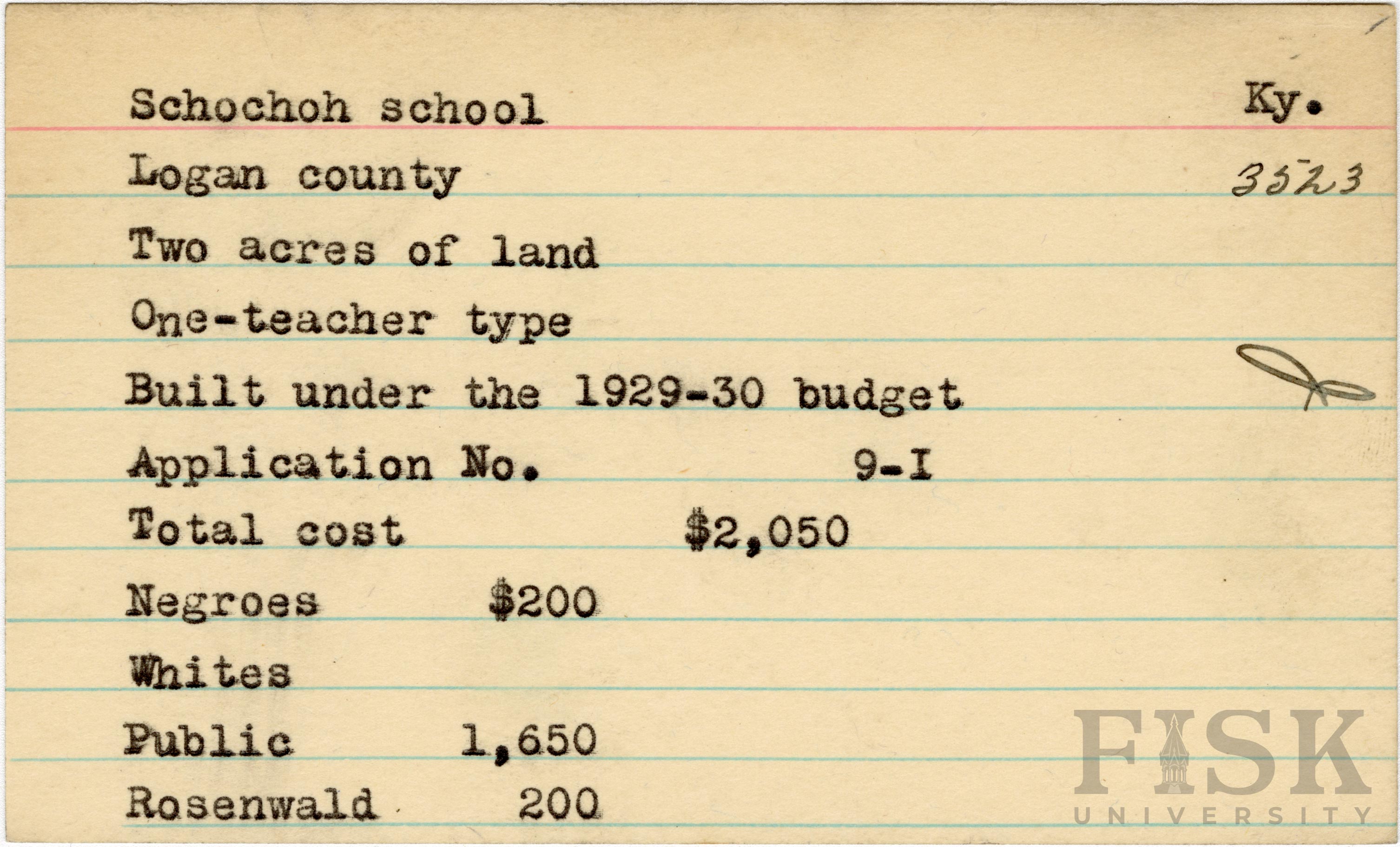 School card from Rosenwald Fund for Schochoh School in Logan County, Kentucky