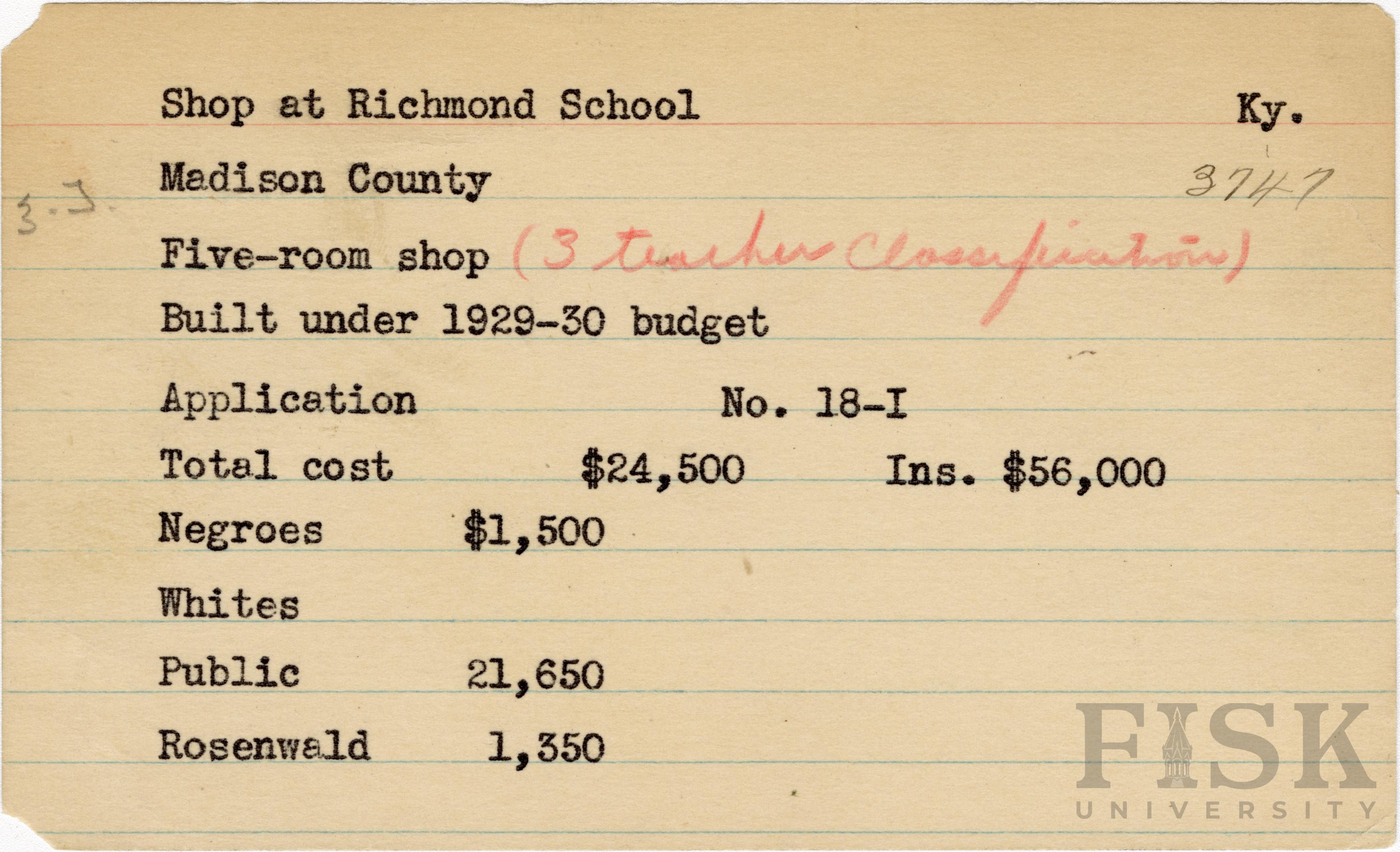 - School card from Rosenwald Fund for the five-room shop at Richmond School in Madison County, Kentucky with a section added to the budget contributions that says, "Ins. $56,000"