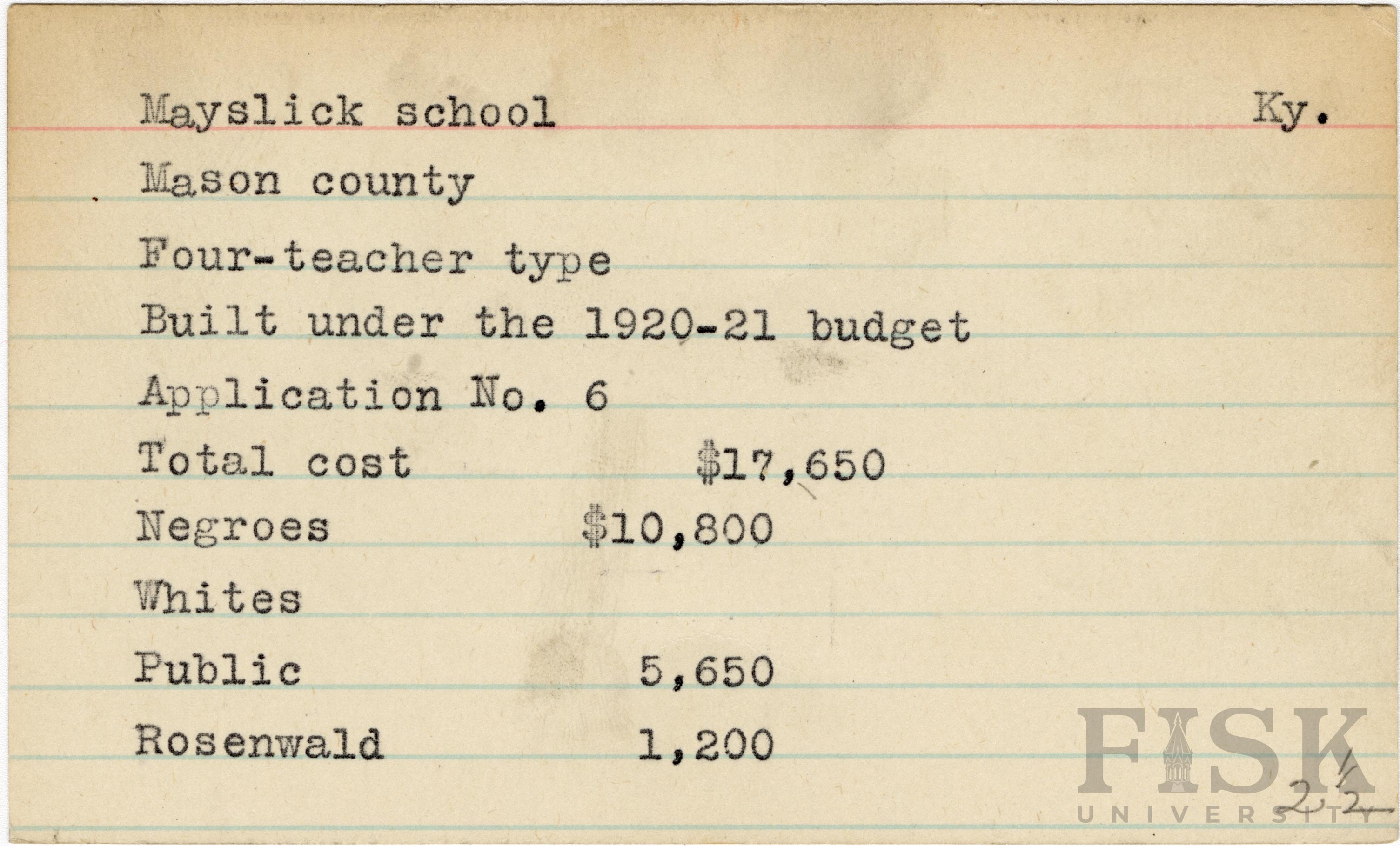 - School card from Rosenwald Fund for Mayslick School in Mason County, Kentucky
