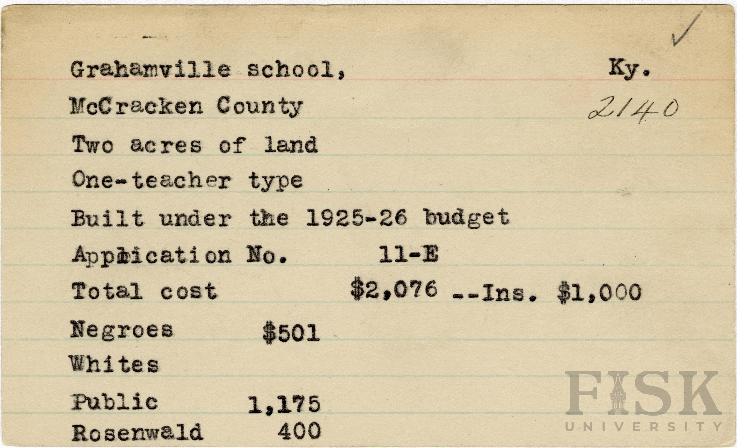- School card from Rosenwald Fund for Grahamville School in McCracken County, Kentucky with a section added to the budget contributions that says, "Ins. $1,000"