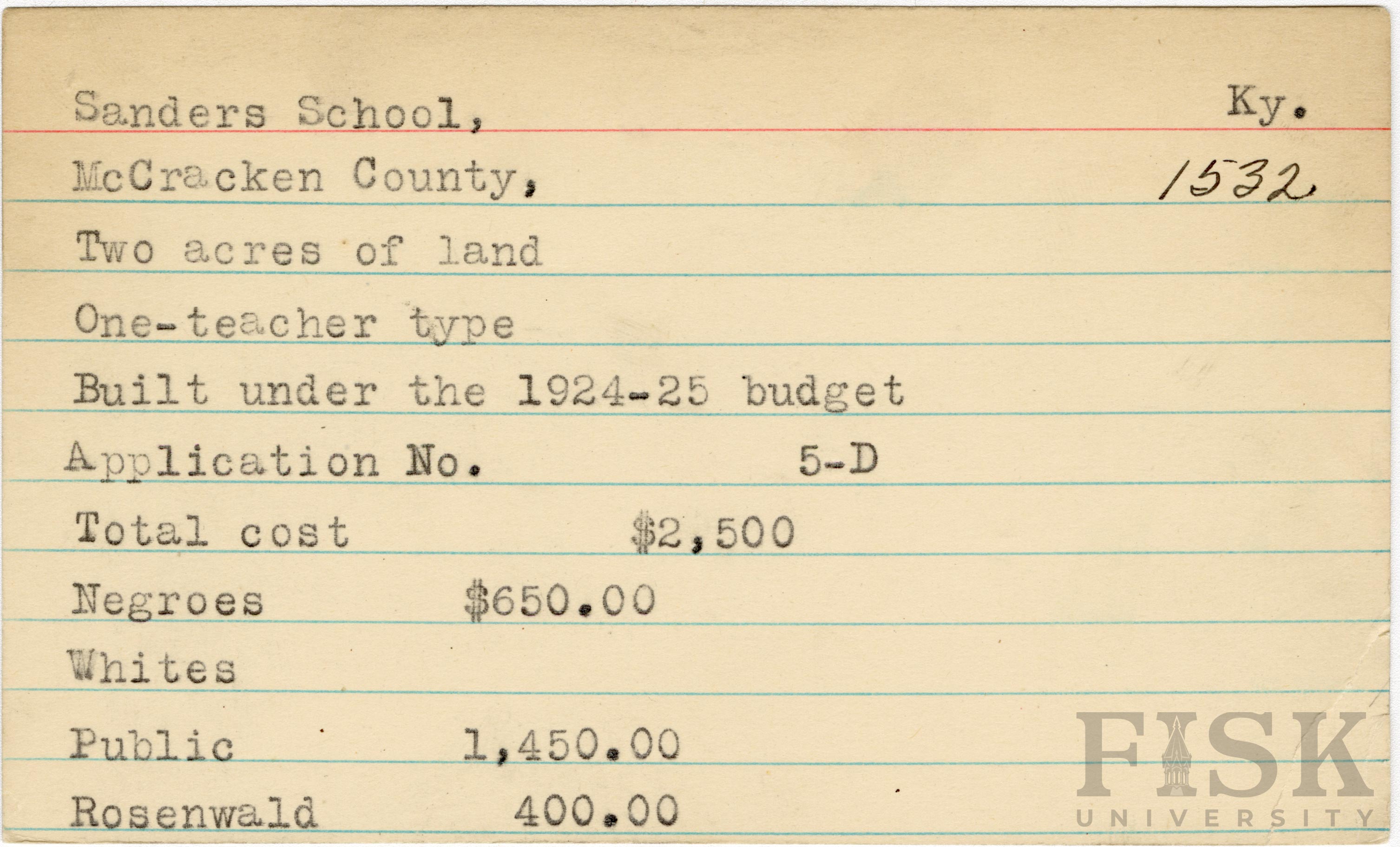 School card from Rosenwald Fund for Sanders School in McCracken County, Kentucky