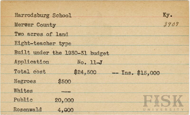 - School card from Rosenwald Fund for Harrodsburg School in Mercer County, Kentucky with a section added to the budget contributions that says, "Ins. $15,000"