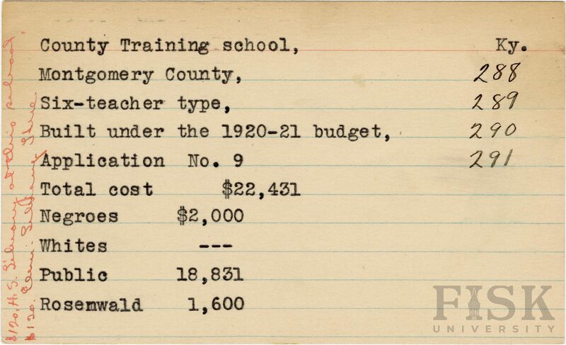 - School card from Rosenwald Fund for County Training School in Montgomery County, Kentucky with handwritten notes on the far left of the card that says, "$120 H. S. library a this school" and "$120 elem library here"