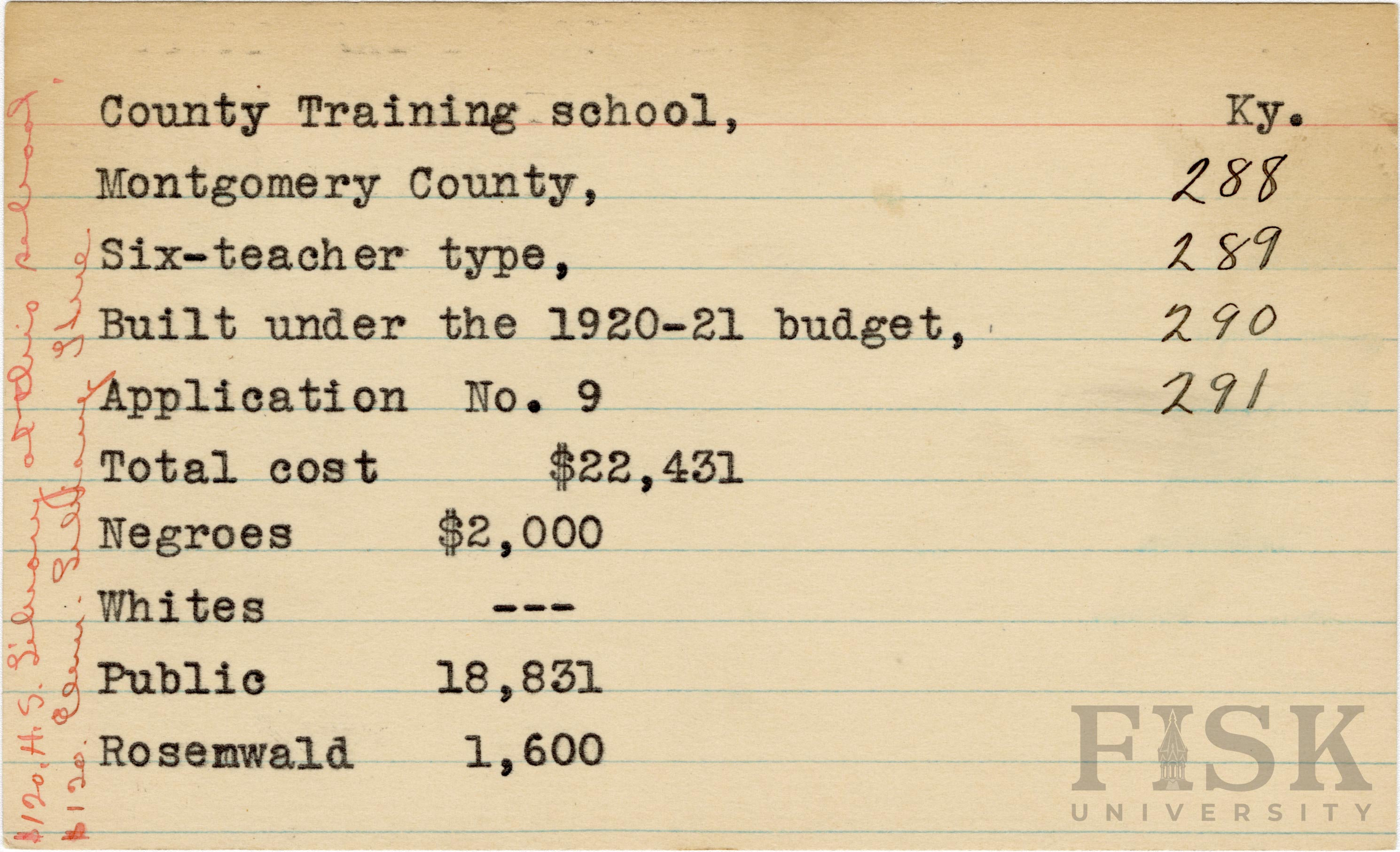 School card from Rosenwald Fund for County Training School in Montgomery County, Kentucky with handwritten notes on the far left of the card that says, "$120 H. S. library a this school" and "$120 elem library here"