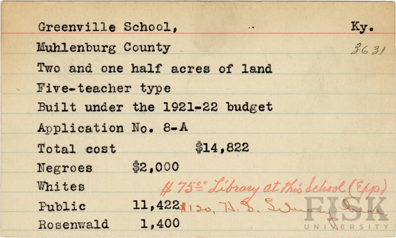 - School card from Rosenwald Fund for Greenville School in Muhlenburg County, Kentucky with handwritten notes that say, "$75.00 library at this school" and "$120 H. S. library here"