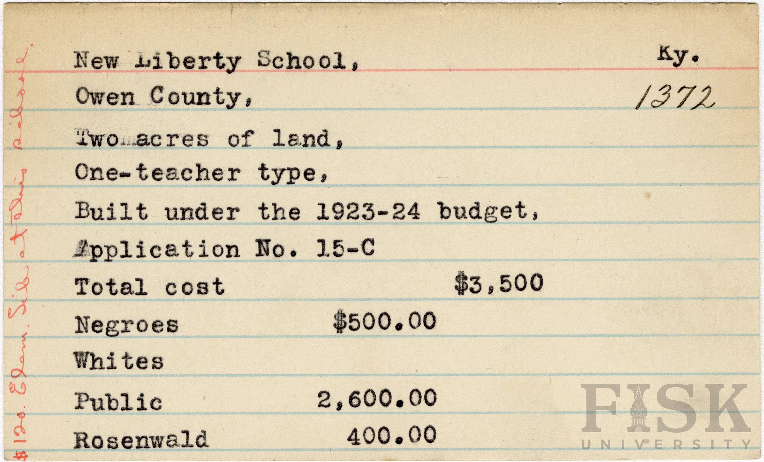 School card from Rosenwald fund for New Liberty School in Owen County, Kentucky with a handwritten note on the far left that says, "$120 elem lib at this school"