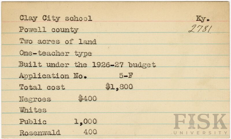 - School card from Rosenwald Fund for Clay City School in Powell County, Kentucky