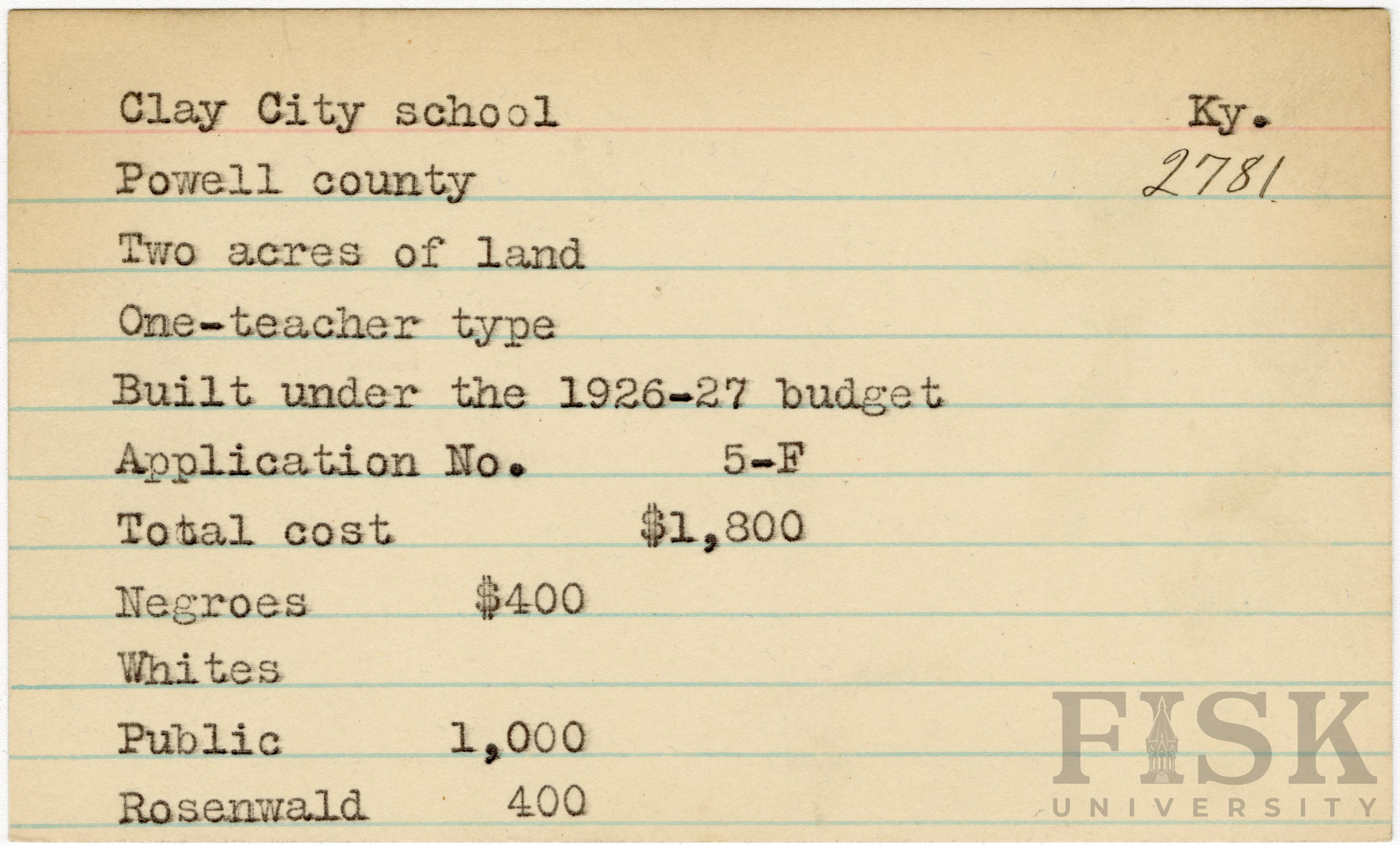 School card from Rosenwald Fund for Clay City School in Powell County, Kentucky