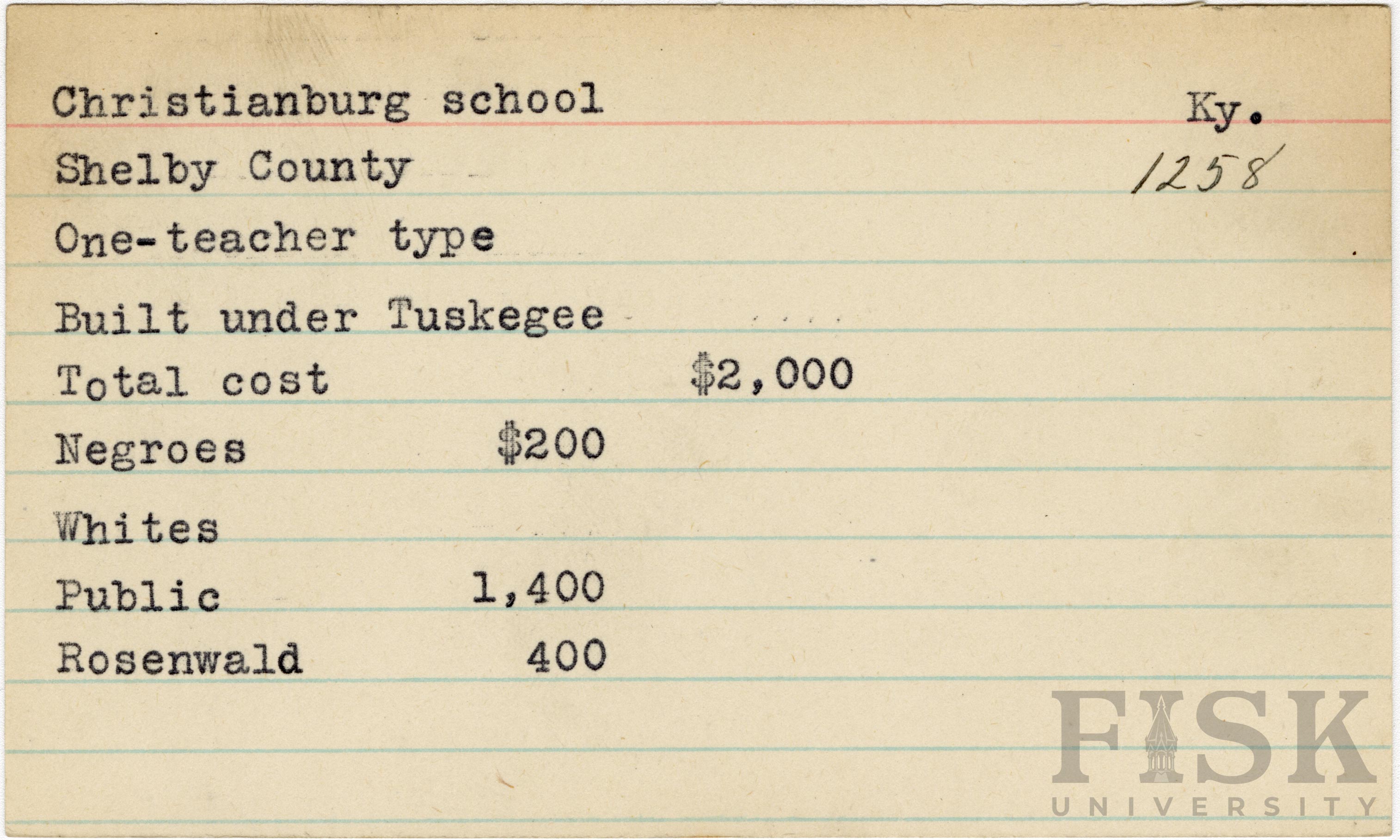 School card from Rosenwald Fund for Christianburg School in Shelby County, Kentucky