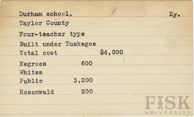 - School card from Rosenwald Fund for Durham School in Taylor County, Kentucky