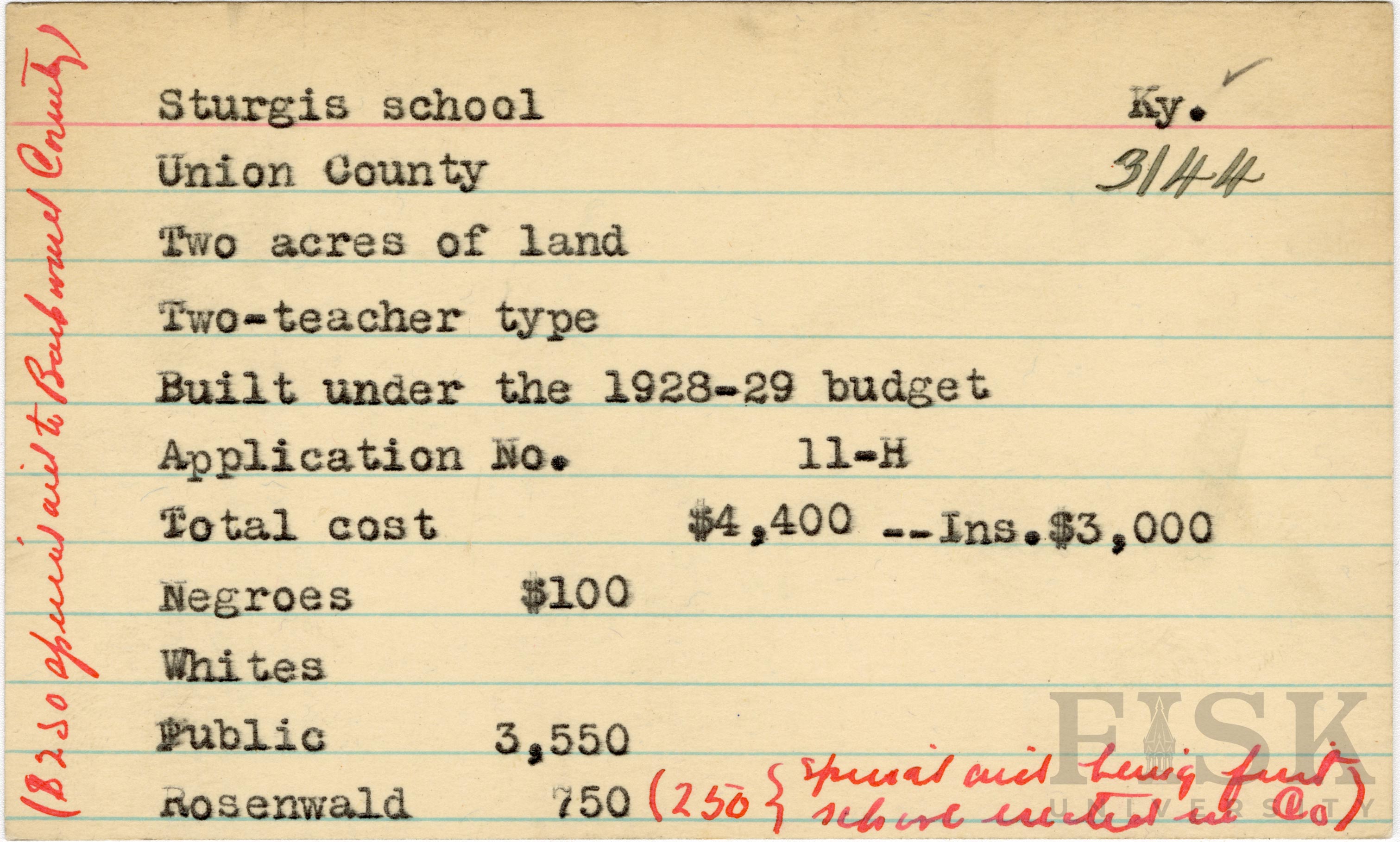 - School card from Rosenwald Fund for Sturgis School in Union County, Kentucky with a section added to the budget contributions that says, "Ins. $3,000". Handwritten notes say, "($250 special aid to Backward County)" and "(250 special aid [unclear] first school erected in Co)"