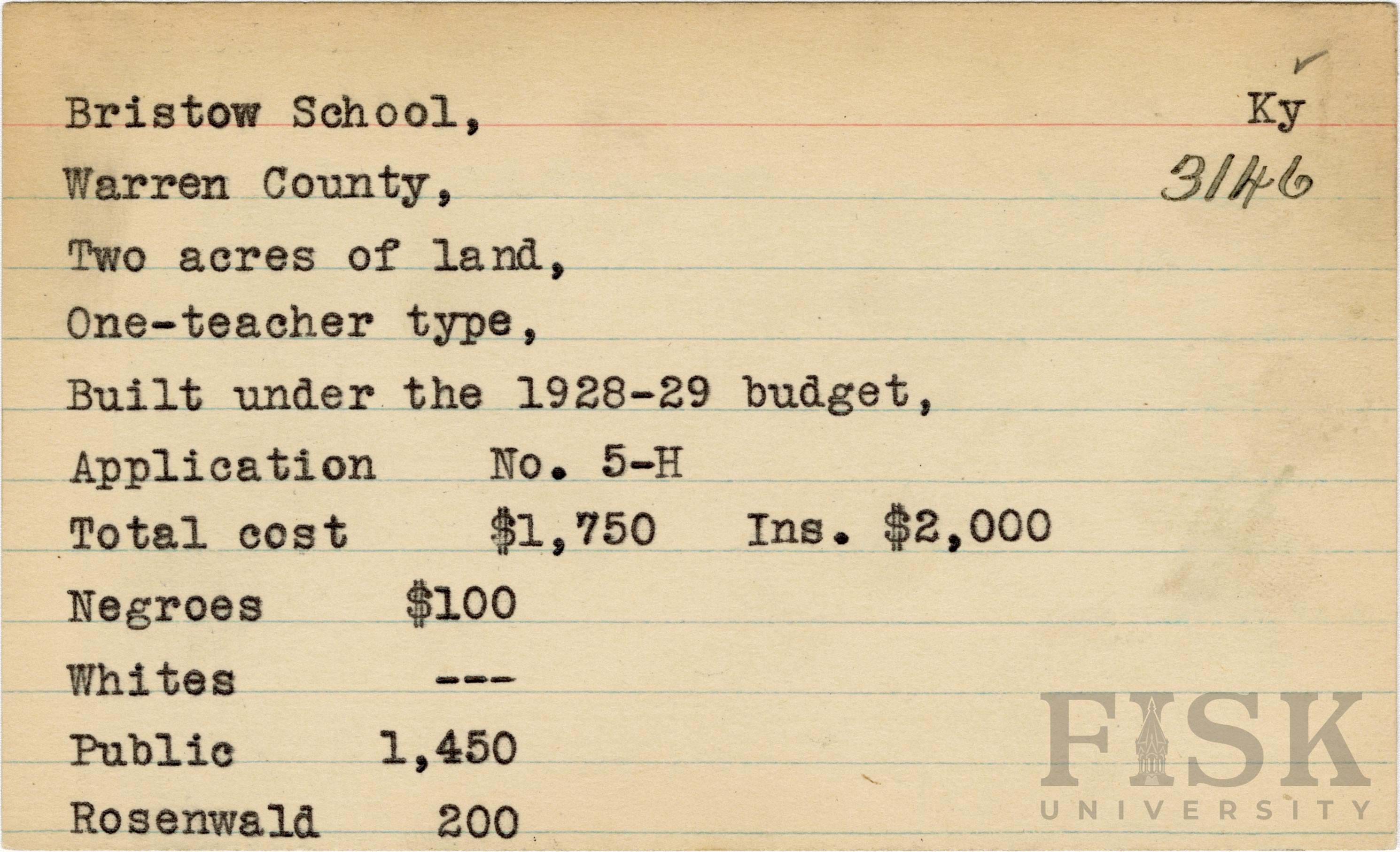 - School card from Rosenwald Fund for Bristow School in Warren County, Kentucky with a section added to the budget contributions that says, "Ins. $2,000"