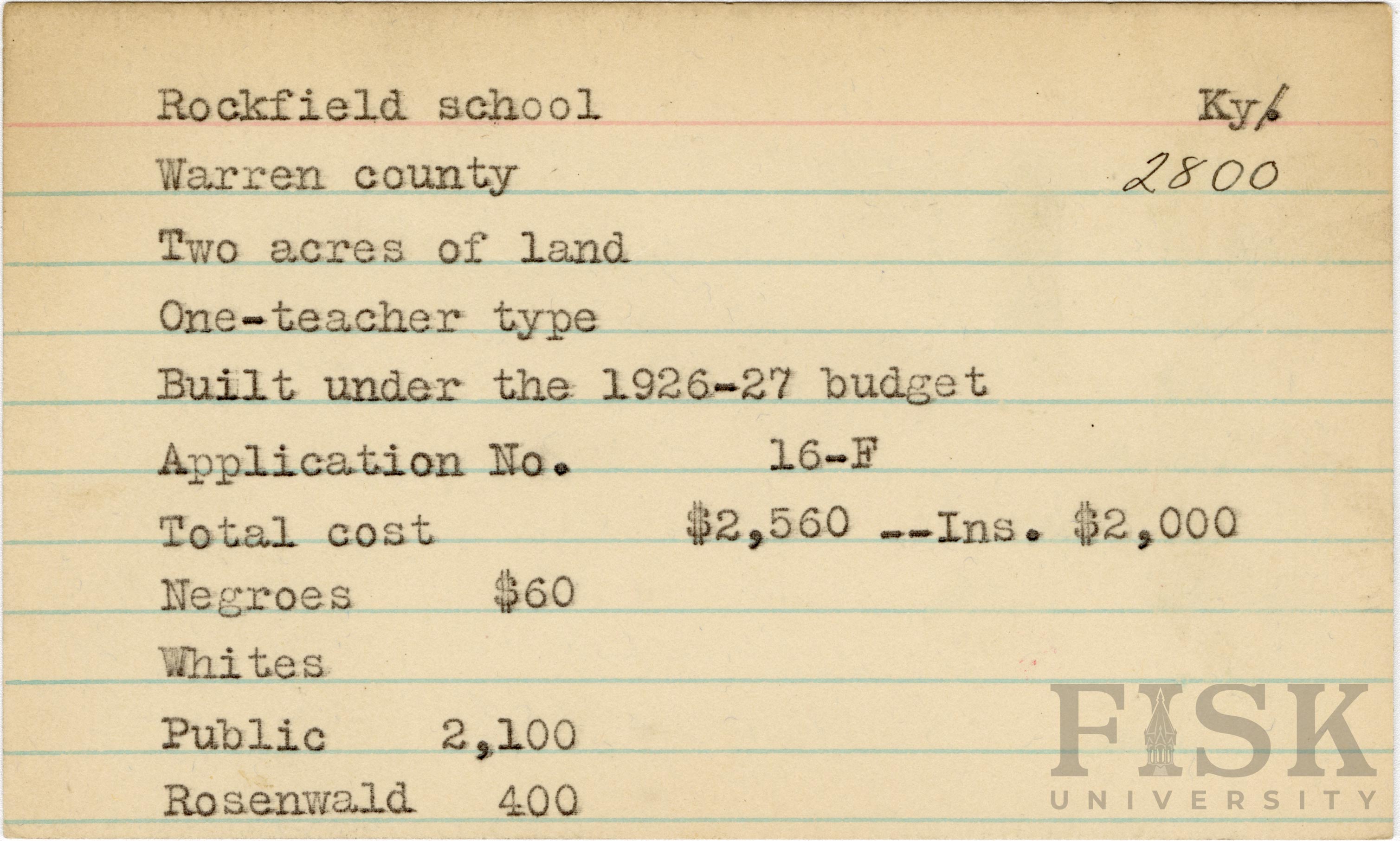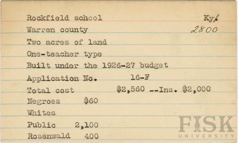 - School card from Rosenwald Fund for Rockfield School in Warren County, Kentucky with a section added to the budget contributions that says, "Ins. $2,000"