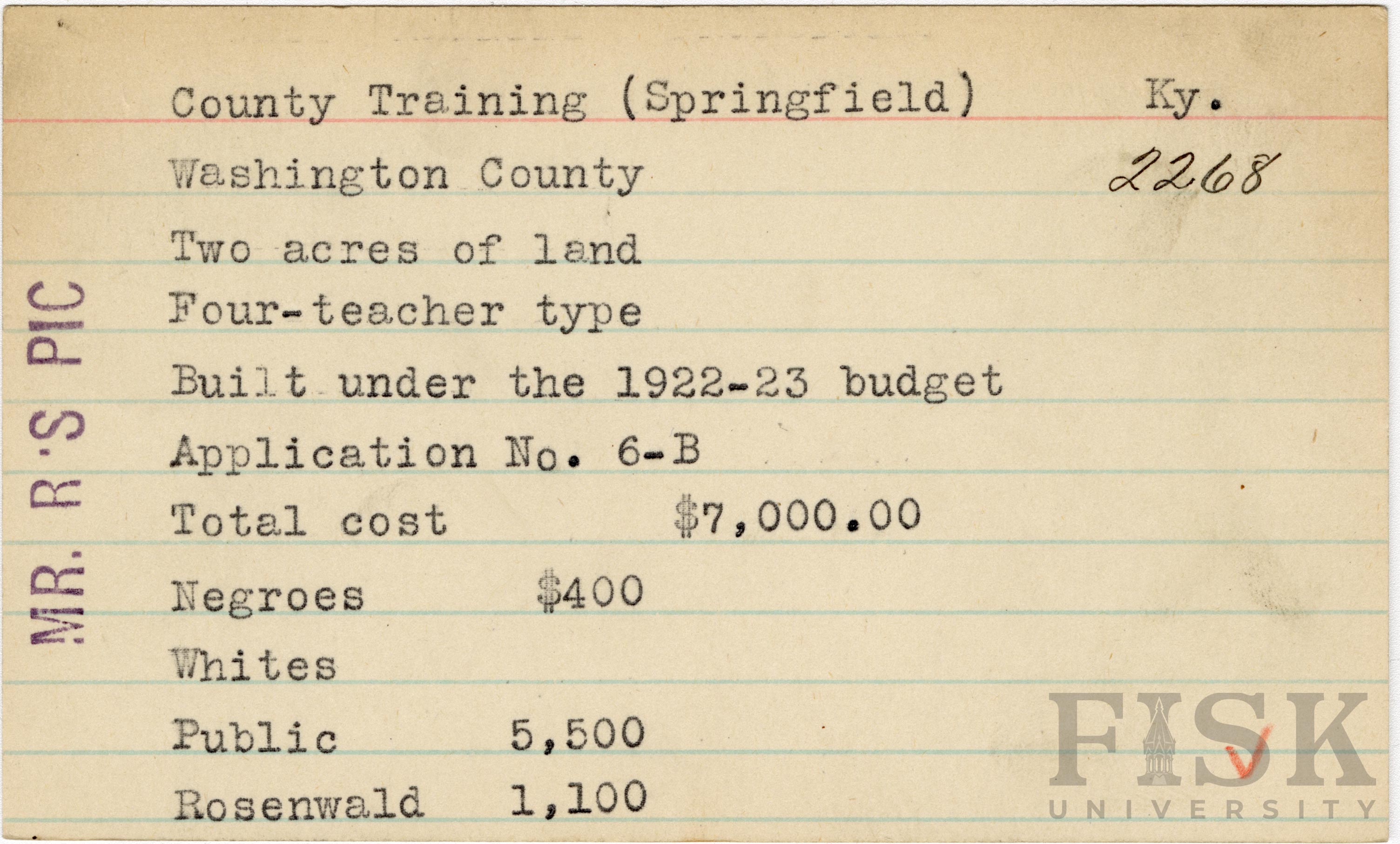 - School card from Rosenwald Fund for County Training School in Washington County, Kentucky with a note on the far left of the card that says, "Mr. R's Pic"