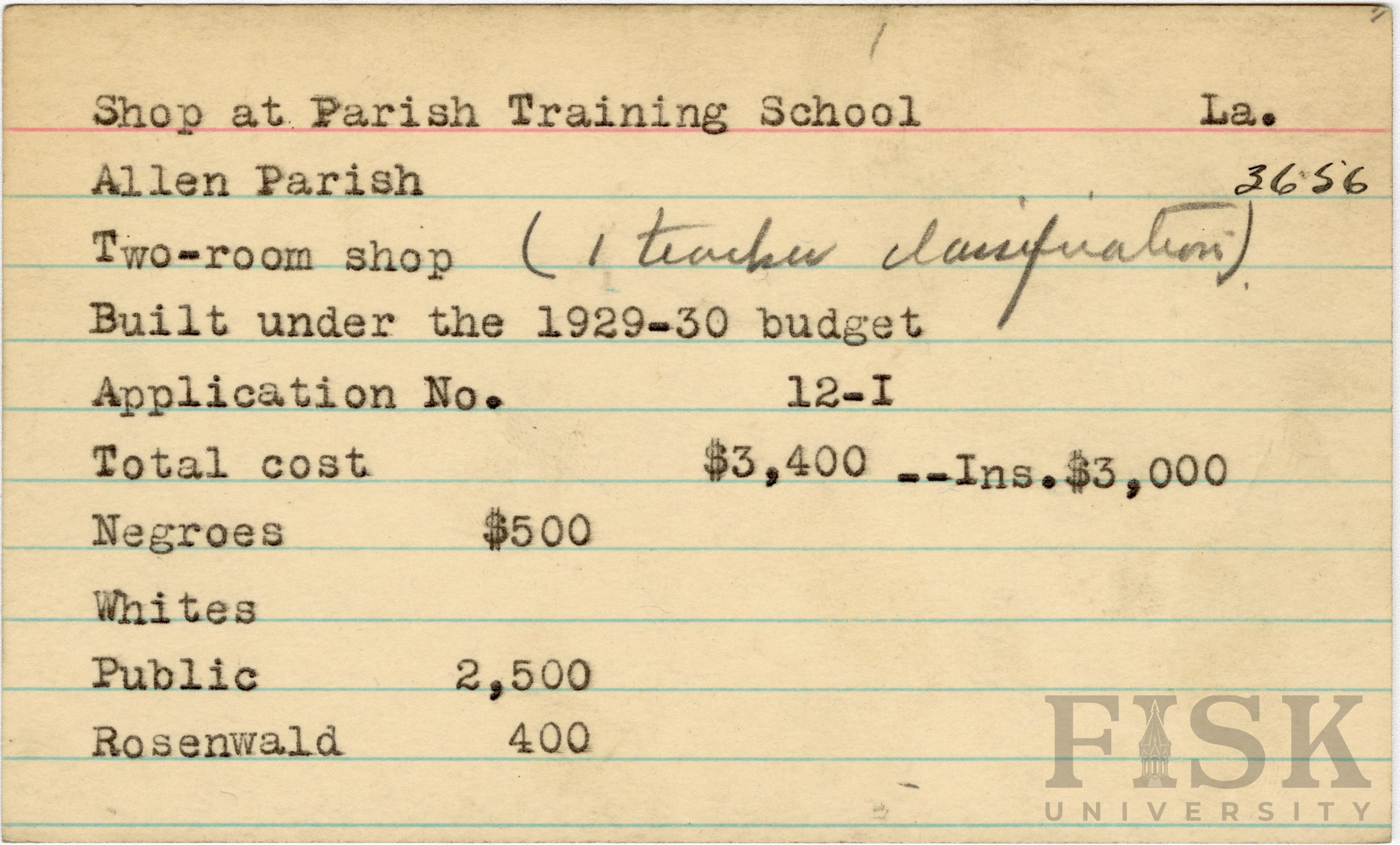 - School card from the Rosenwald Fund for the two-room shop at Parish Training School in Allen Parish, Louisiana with a section added to the budget contributions that says, "Ins. $3,000"n