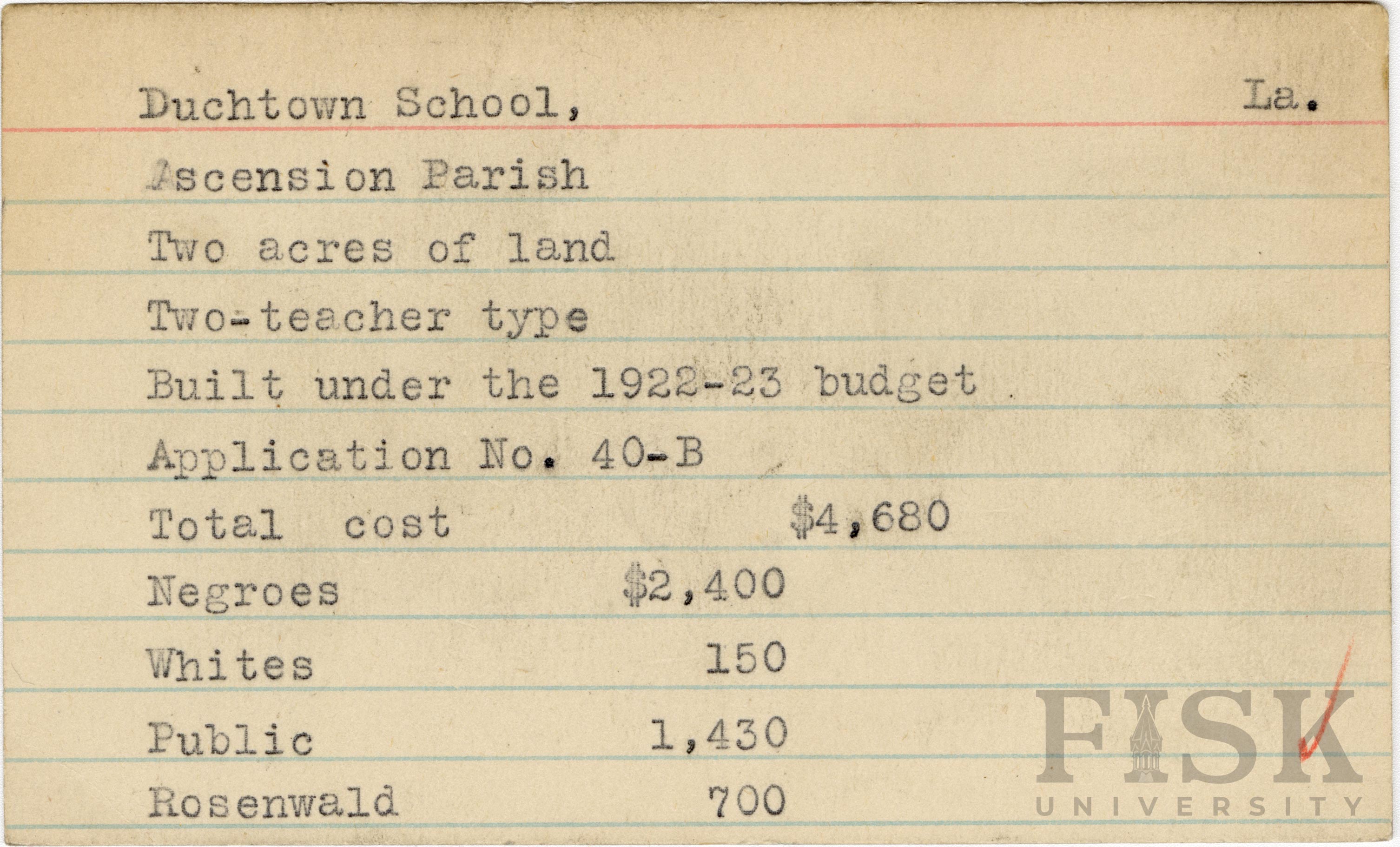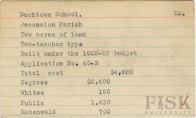 - School card from the Rosenwald Fund for Duchtown School in Ascension Parish, Louisiana