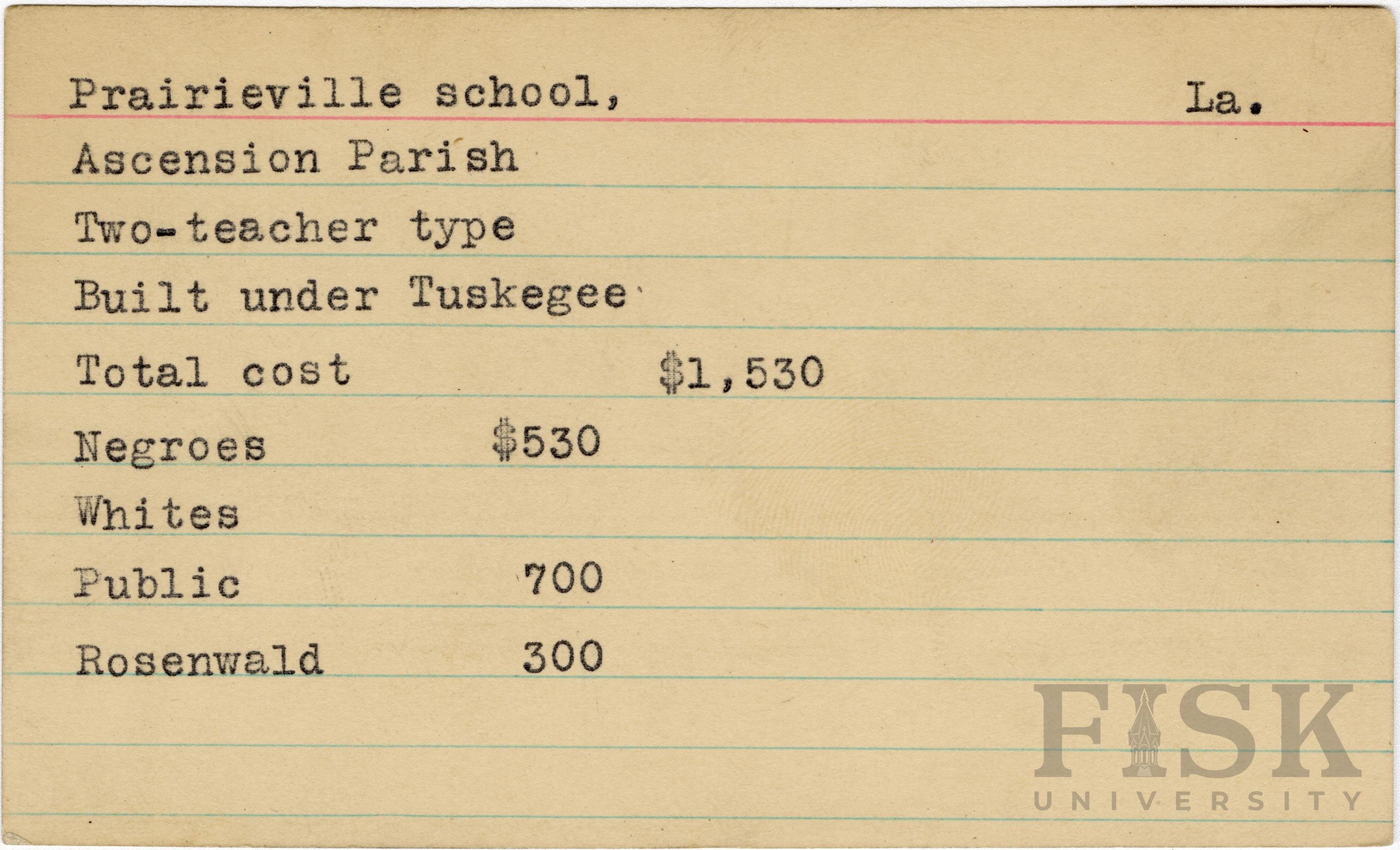 - School card from the Rosenwald Fund for Prairieville School in Ascension Parish, Louisiana