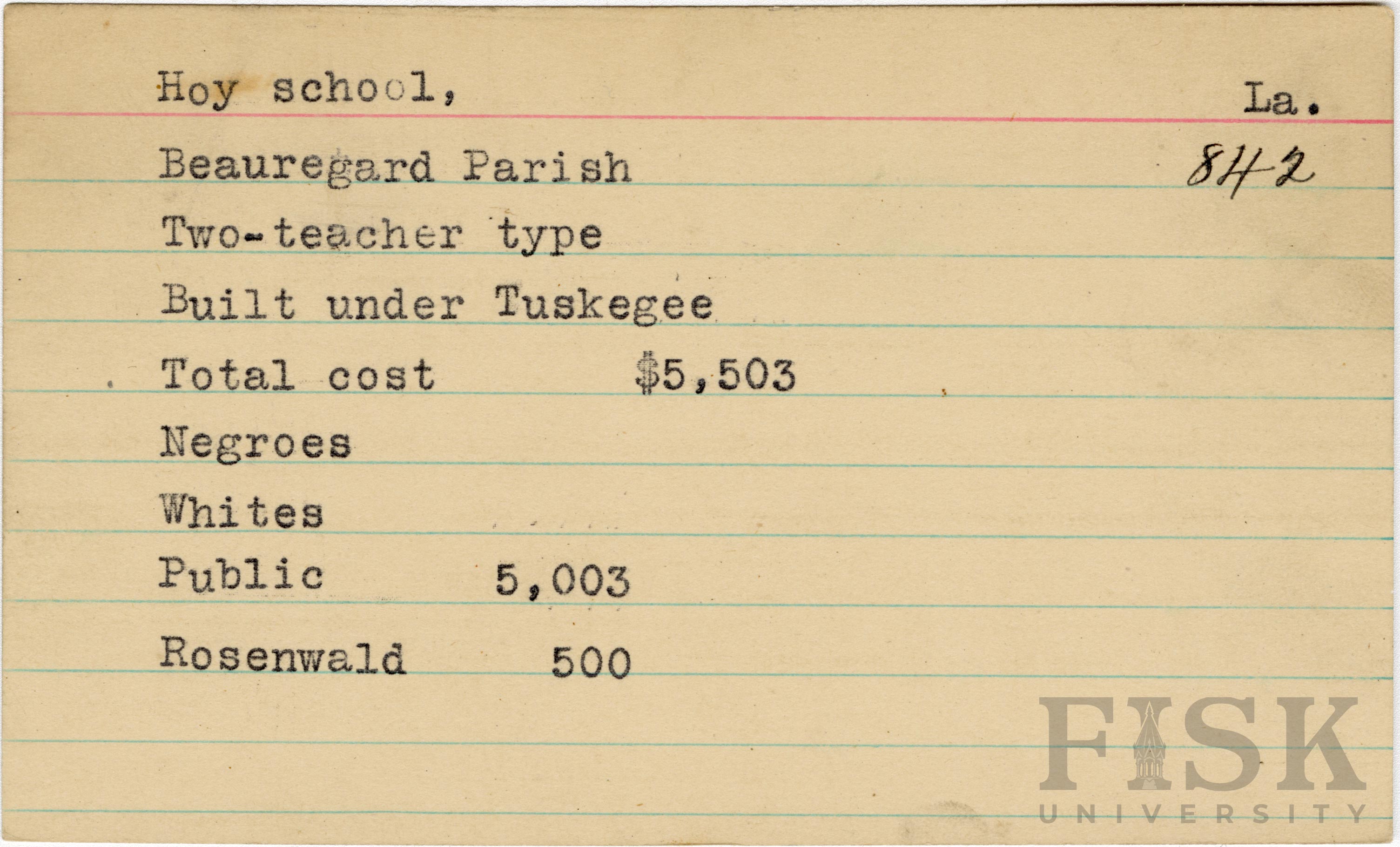- School card from the Rosenwald Fund for Hoy School in Beauregard Parish, Louisiana