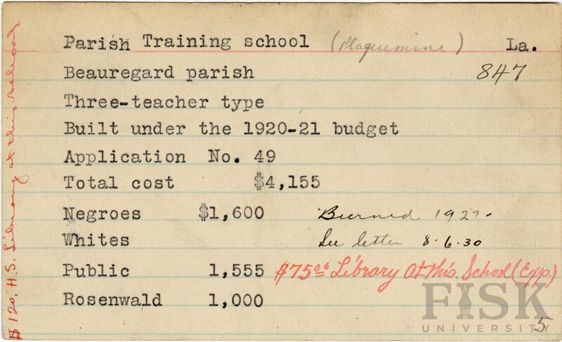 - School card from the Rosenwald Fund for Parish Training School in Beauregard Parish, Louisiana. Handwritten notes say, "Burned 1927. See letter 8-6-30," "$75.00 library at this school (Exp)", and "$120 H.S. library at this school."