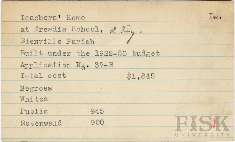 - School card from the Rosenwald Fund for the teacher's home at Arcadia School in Bienville Parish, Louisiana