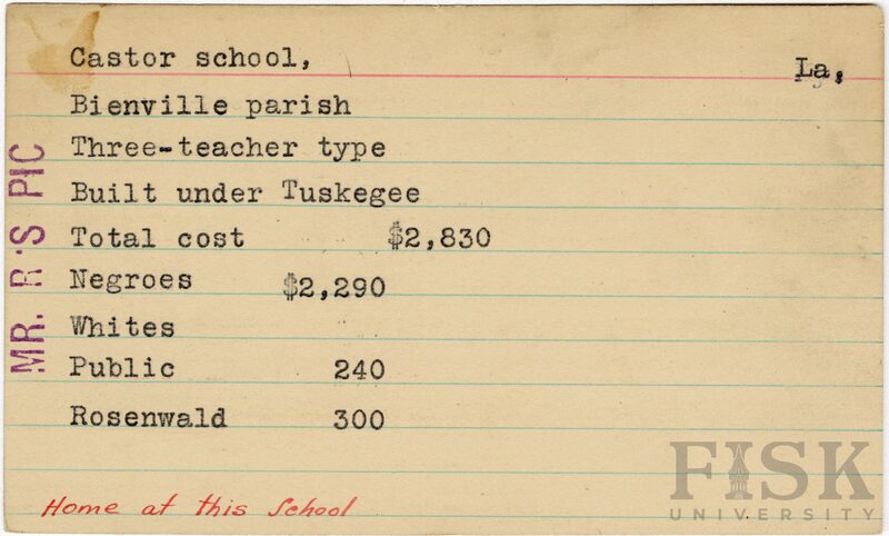School card from the Rosenwald Fund for Castor School in Bienville Parish, Louisiana with a note on the far left of that card says, "Mr. R's Pic." A handwritten note on the bottom of the card says, "Home at this school".