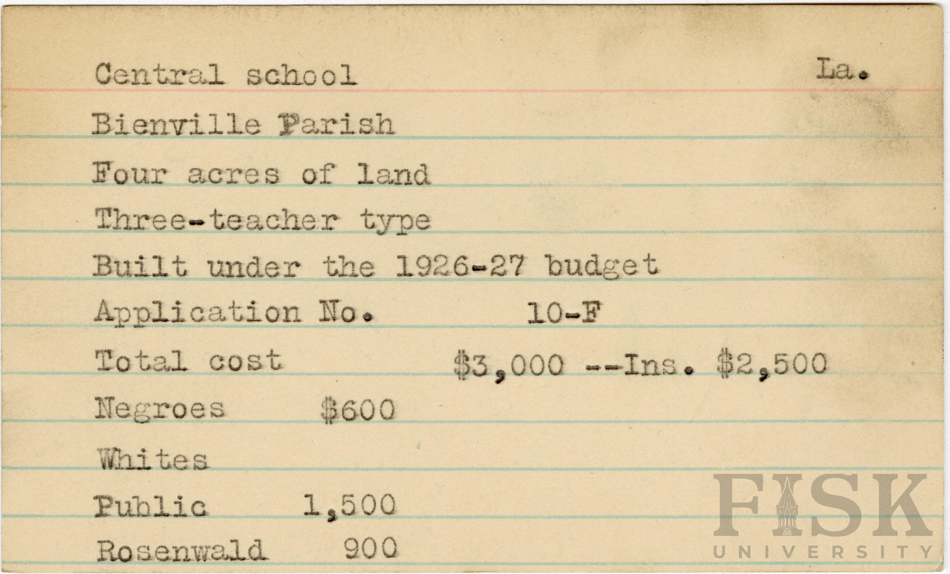 - School card from the Rosenwald Fund for Central School in Bienville Parish, Louisiana with a section added to the budget contributions that says, "Ins. $2,500"