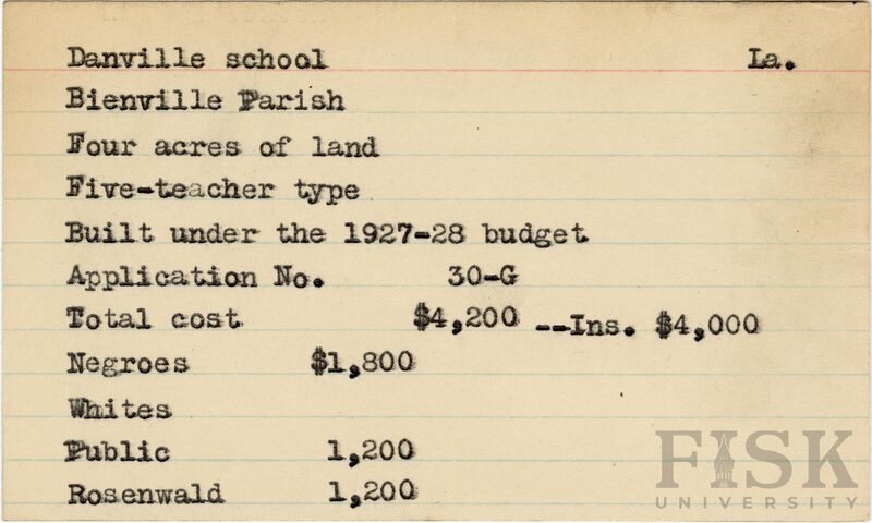 - School card from the Rosenwald Fund for Danville School in Bienville Parish, Louisiana with a section added to the budget contributions that says, "Ins. $4,000"