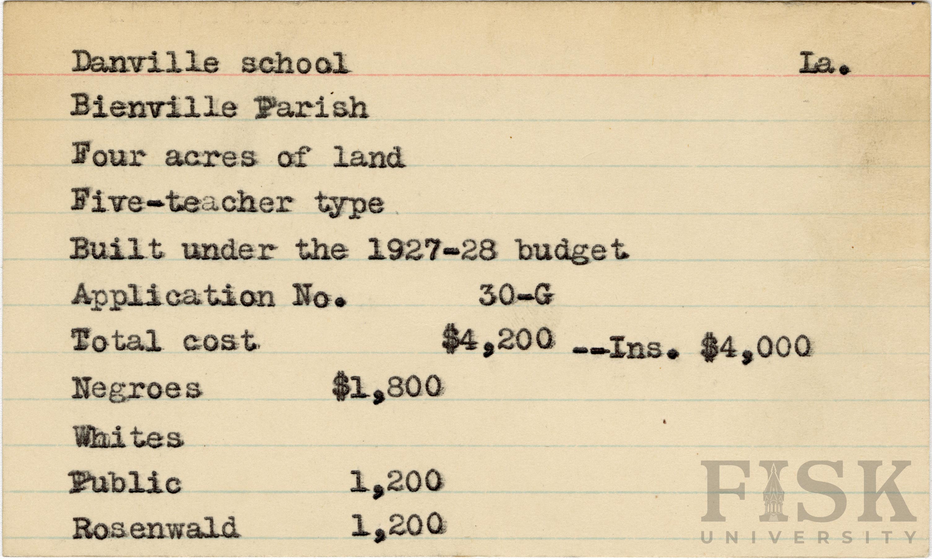 School card from the Rosenwald Fund for Danville School in Bienville Parish, Louisiana with a section added to the budget contributions that says, "Ins. $4,000"