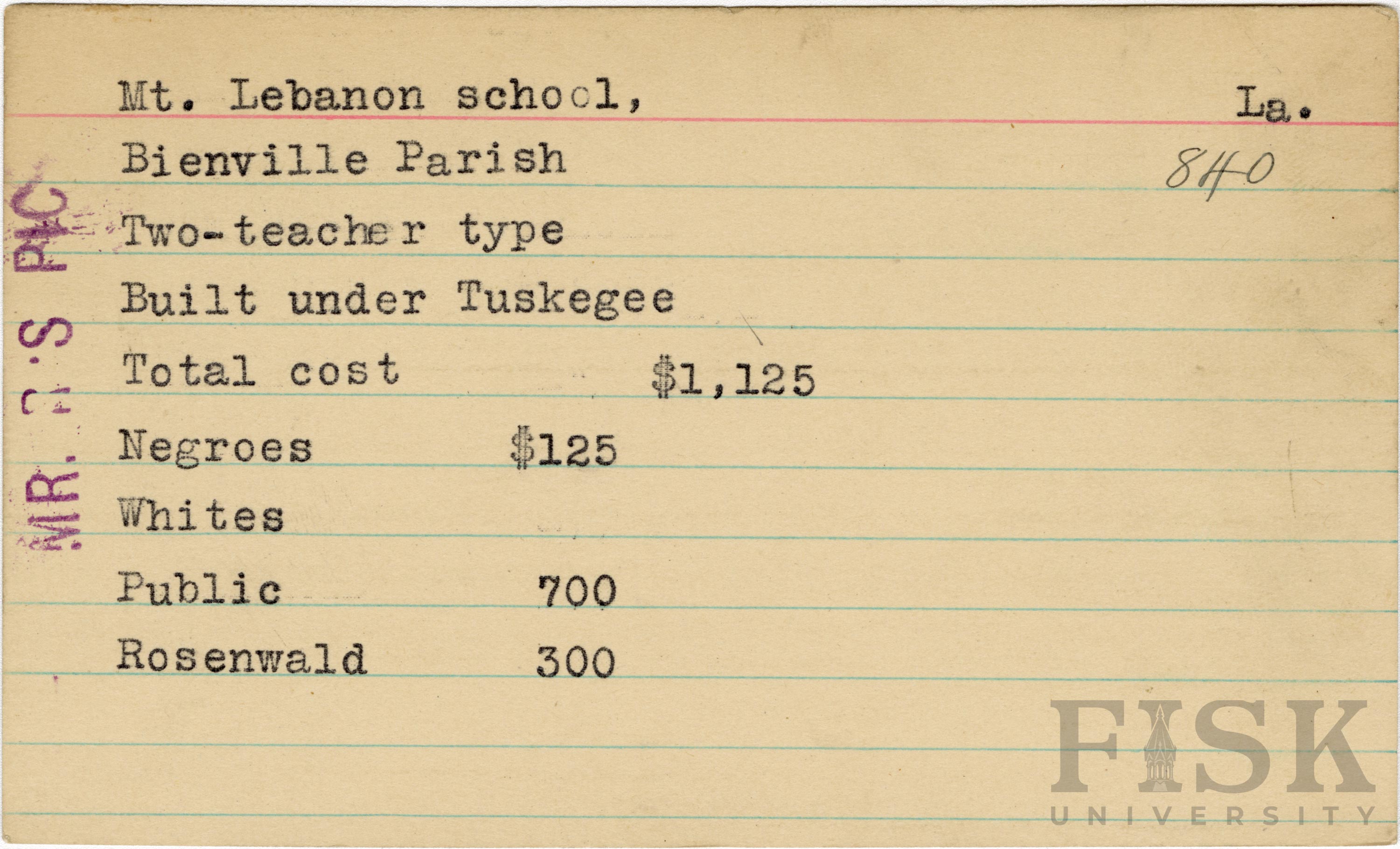 - School card from the Rosenwald Fund for Mt. Lebanon School in Bienville Parish, Louisiana with a note on the far left that says, "Mr. R's Pic"