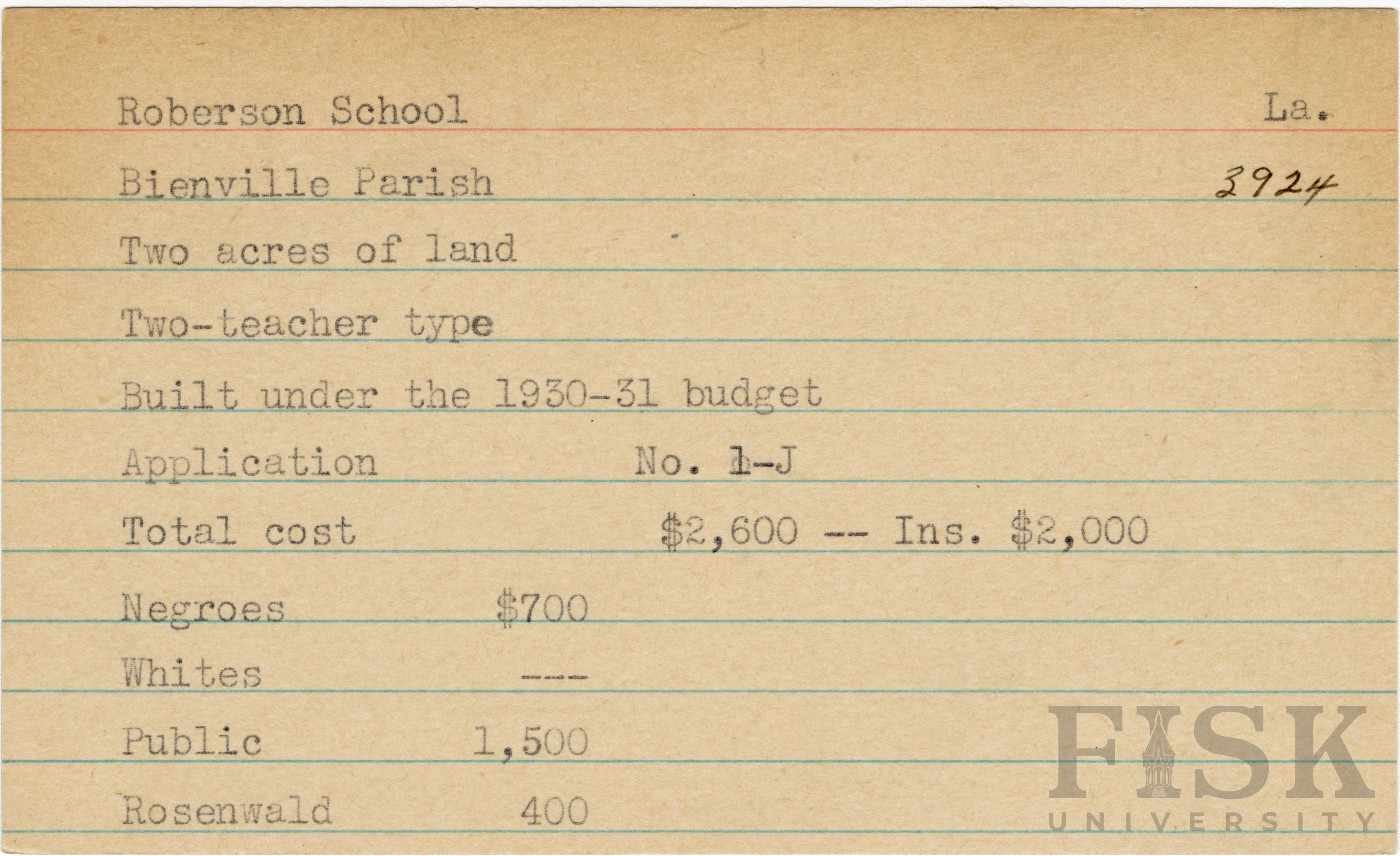School card from the Rosenwald Fund for Roberson School in Bienville Parish, Louisiana with a section added to the budget contributions that says, "Ins. $2,000"