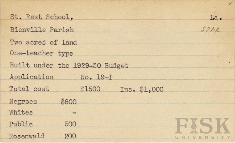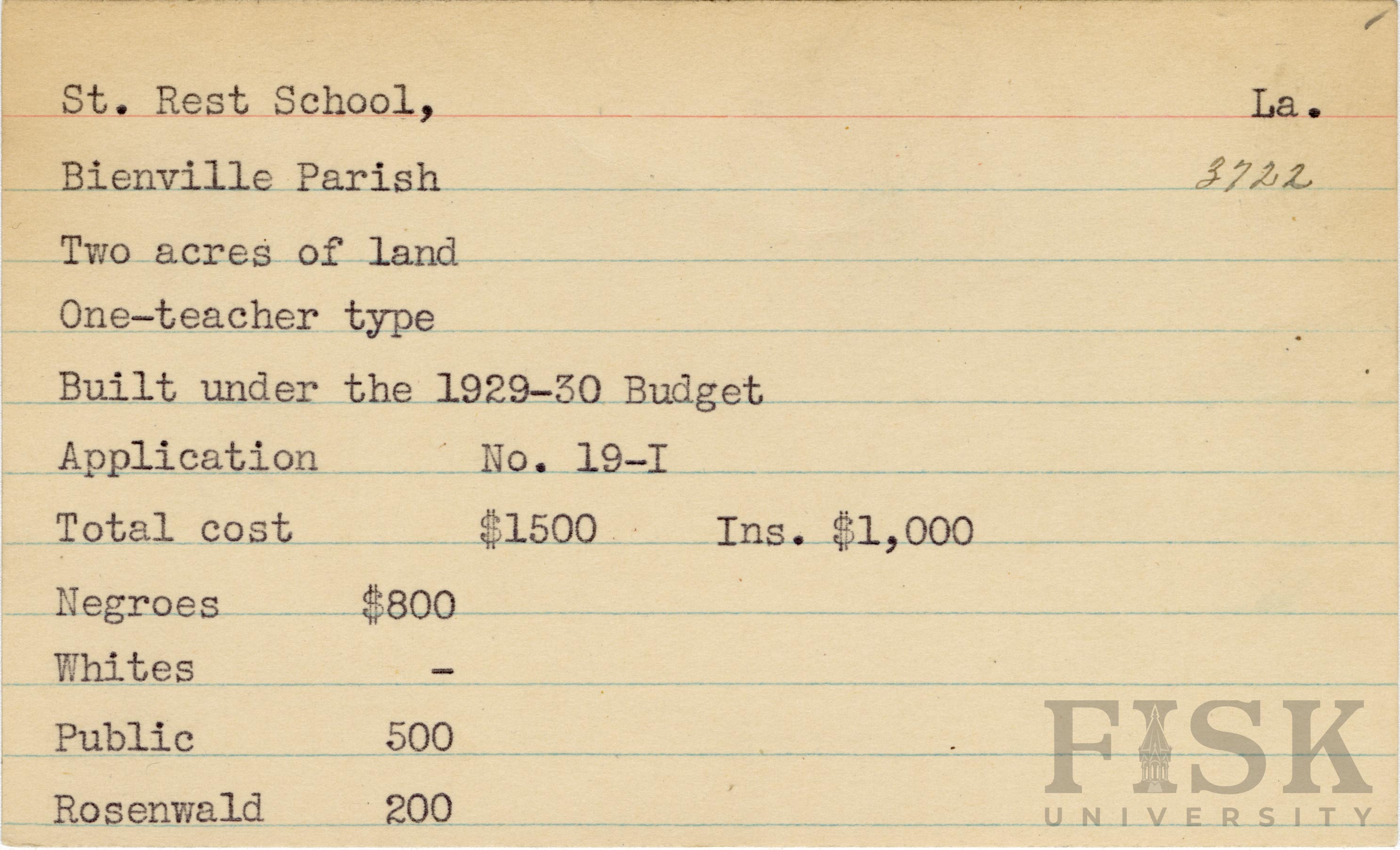 School card from the Rosenwald Fund for St. Rest School in Bienville Parish, Louisiana with a section added to the budget contributions that says, "Ins. $1,000"