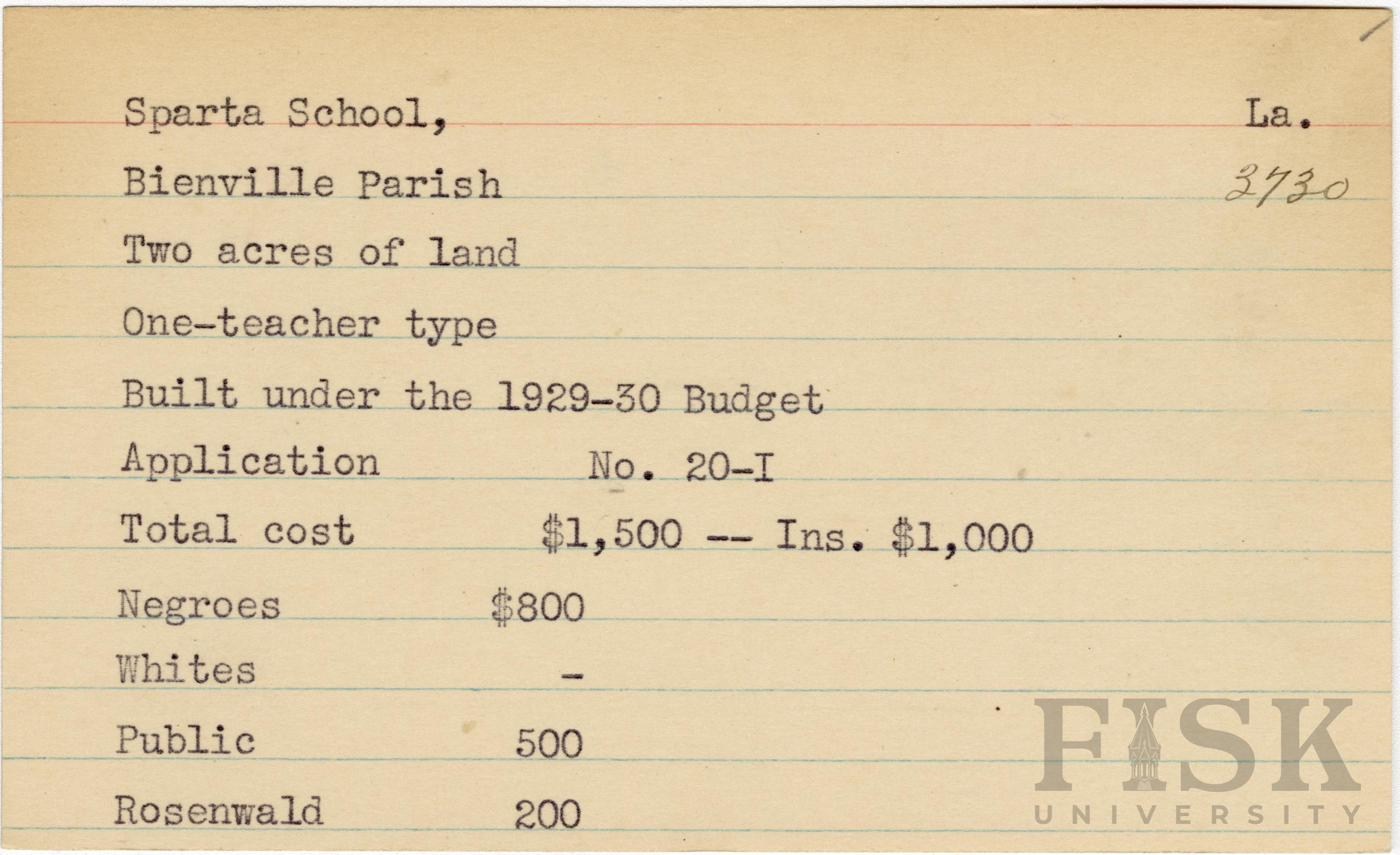School card from the Rosenwald Fund for Sparta School in Bienville Parish, Louisiana with a section added to the budget contributions that says, "Ins. $1,000"