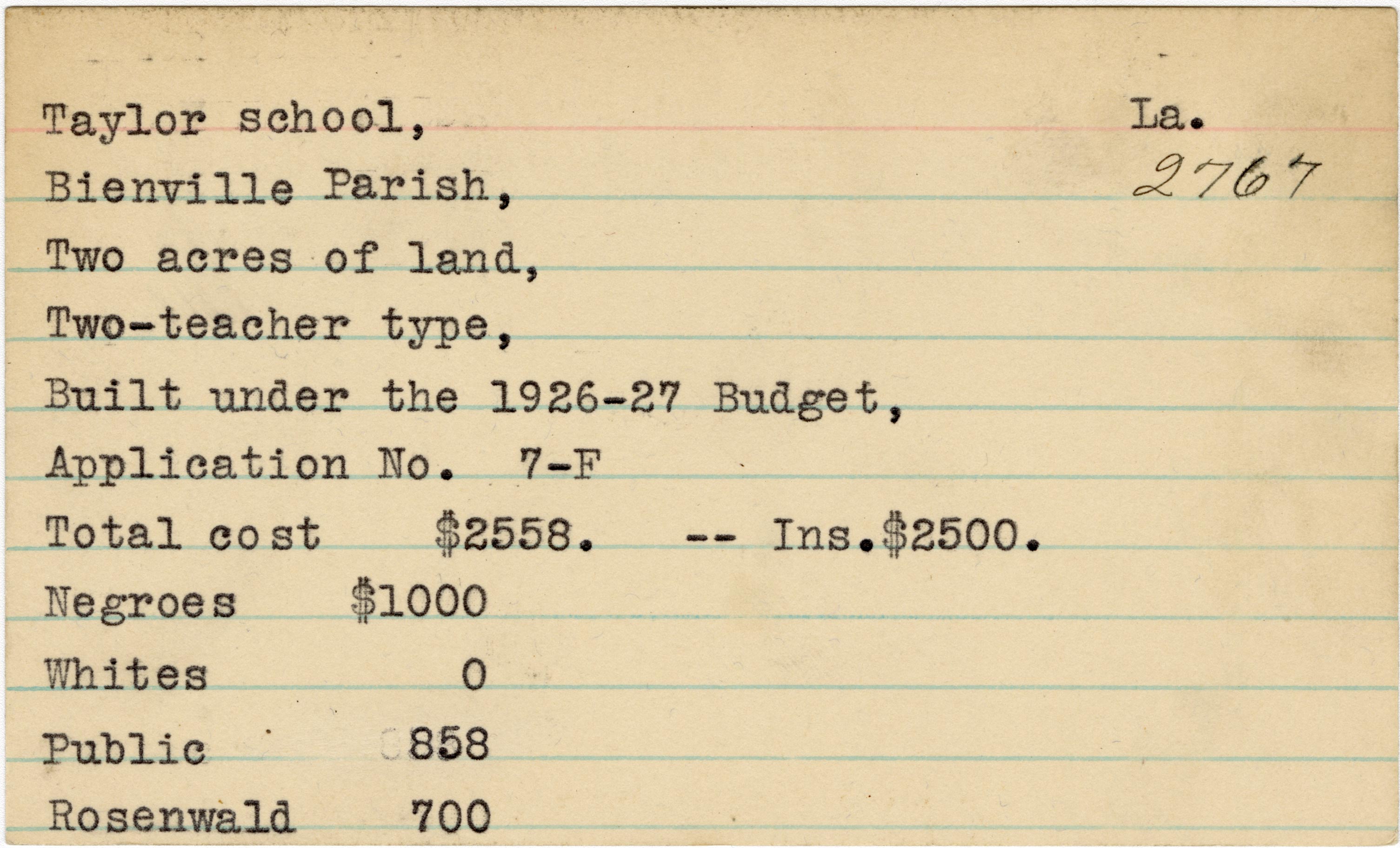 School card from the Rosenwald Fund for Taylor School in Bienville Parish, Louisiana with a section added to the budget contributions that says, "Ins. $2,500"
