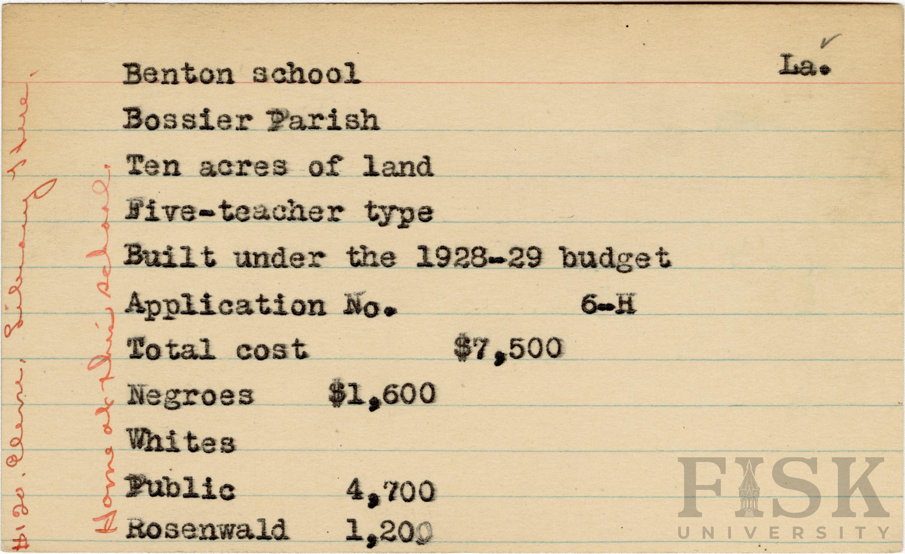 School card from the Rosenwald Fund for Benton School in Bossier Parish, Louisiana with handwritten notes on the far left of the card that says, "$120 elem library here" and "Home at this school"