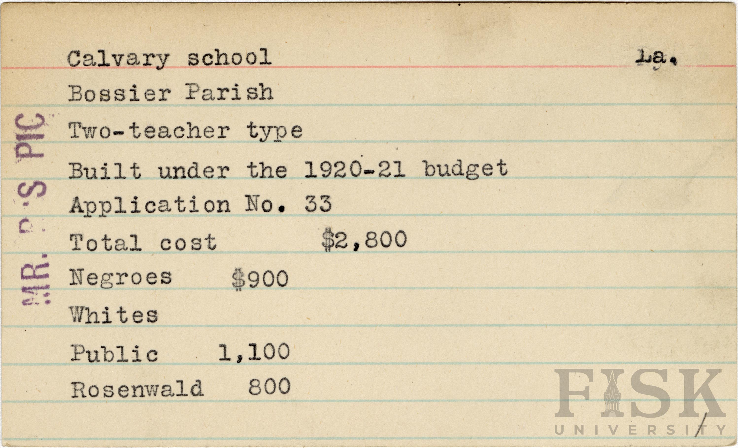 - School card from the Rosenwald Fund for Calvary School in Bossier Parish, Louisiana with a note on the far left of the card that says, "Mr. R's Pic"