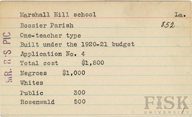 - School card from the Rosenwald Fund for Marshall Hill School in Bossier Parish, Louisiana with a note on the far left of the card that says, "Mr. R's Pic"