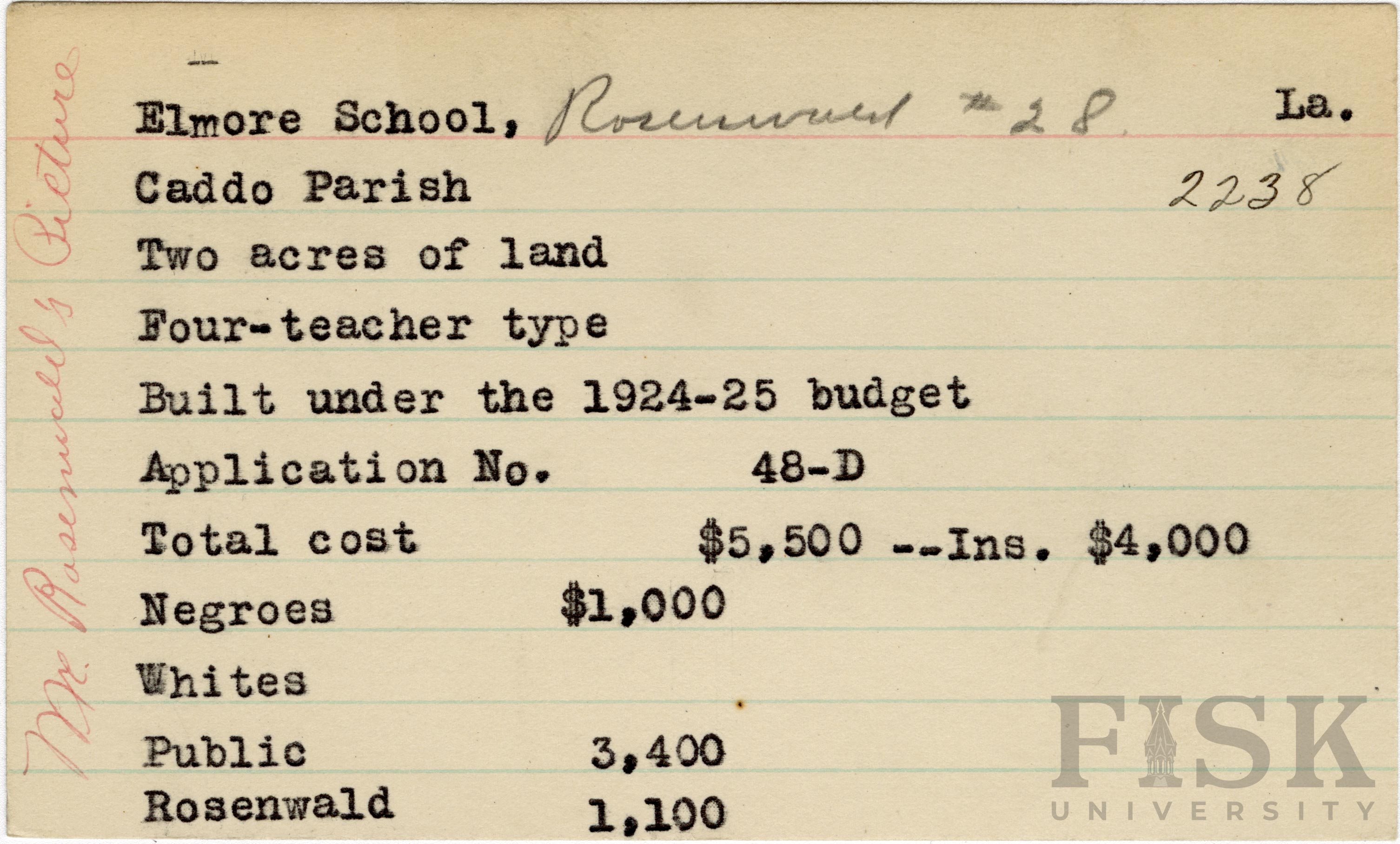 - School card from the Rosenwald Fund for Elmore School in Caddo Parish, Louisiana with a section added to the budget contributions that says, "Ins. $4,000". A handwritten note on the far left of the card says, "Mr. Rosenwald's Picture".