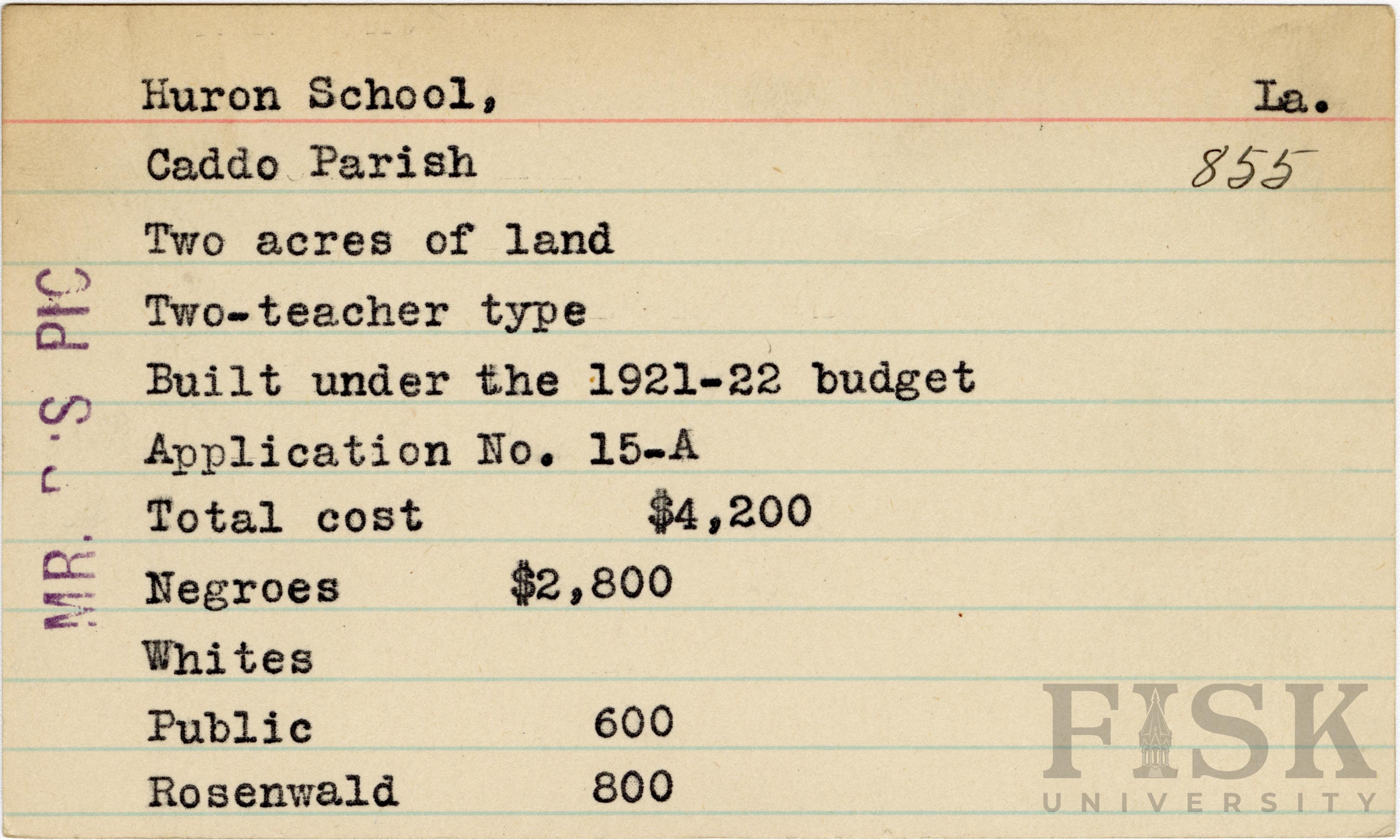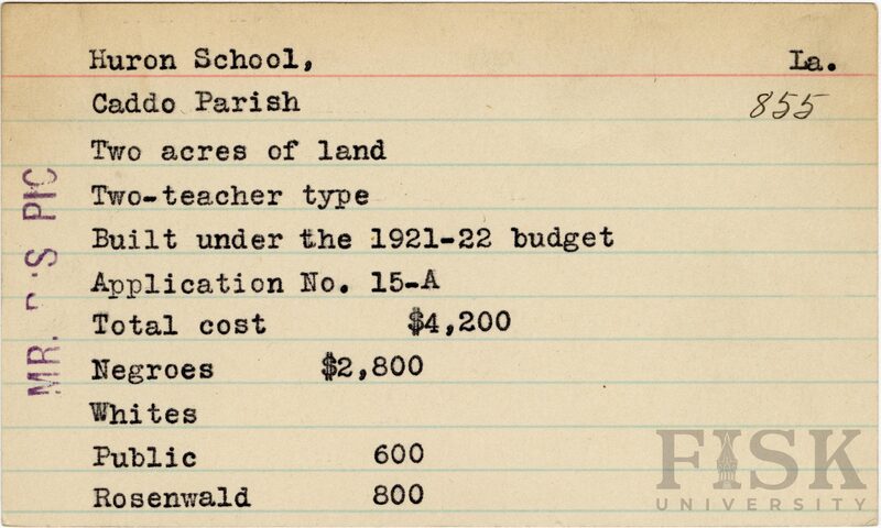 - School card from the Rosenwald Fund for Huron School in Caddo Parish, Louisiana with a note on the far left of the card that says, "Mr. R's Pic"