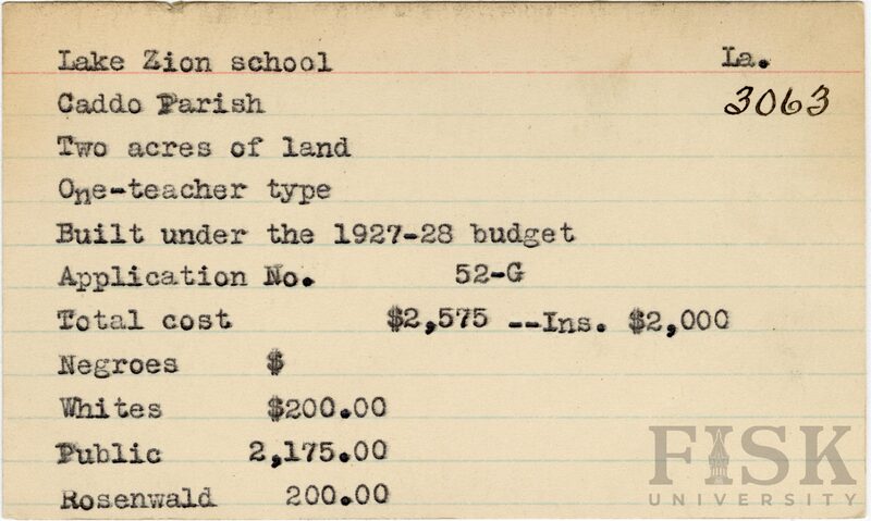 - School card from the Rosenwald Fund for Lake Zion School in Caddo Parish, Louisiana with a section added to the budget contributions that says, "Ins. $2,000"