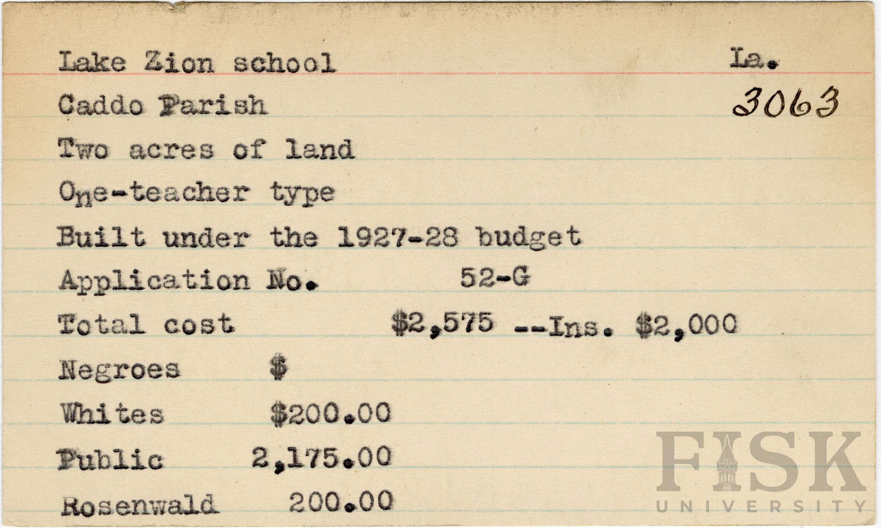 School card from the Rosenwald Fund for Lake Zion School in Caddo Parish, Louisiana with a section added to the budget contributions that says, "Ins. $2,000"