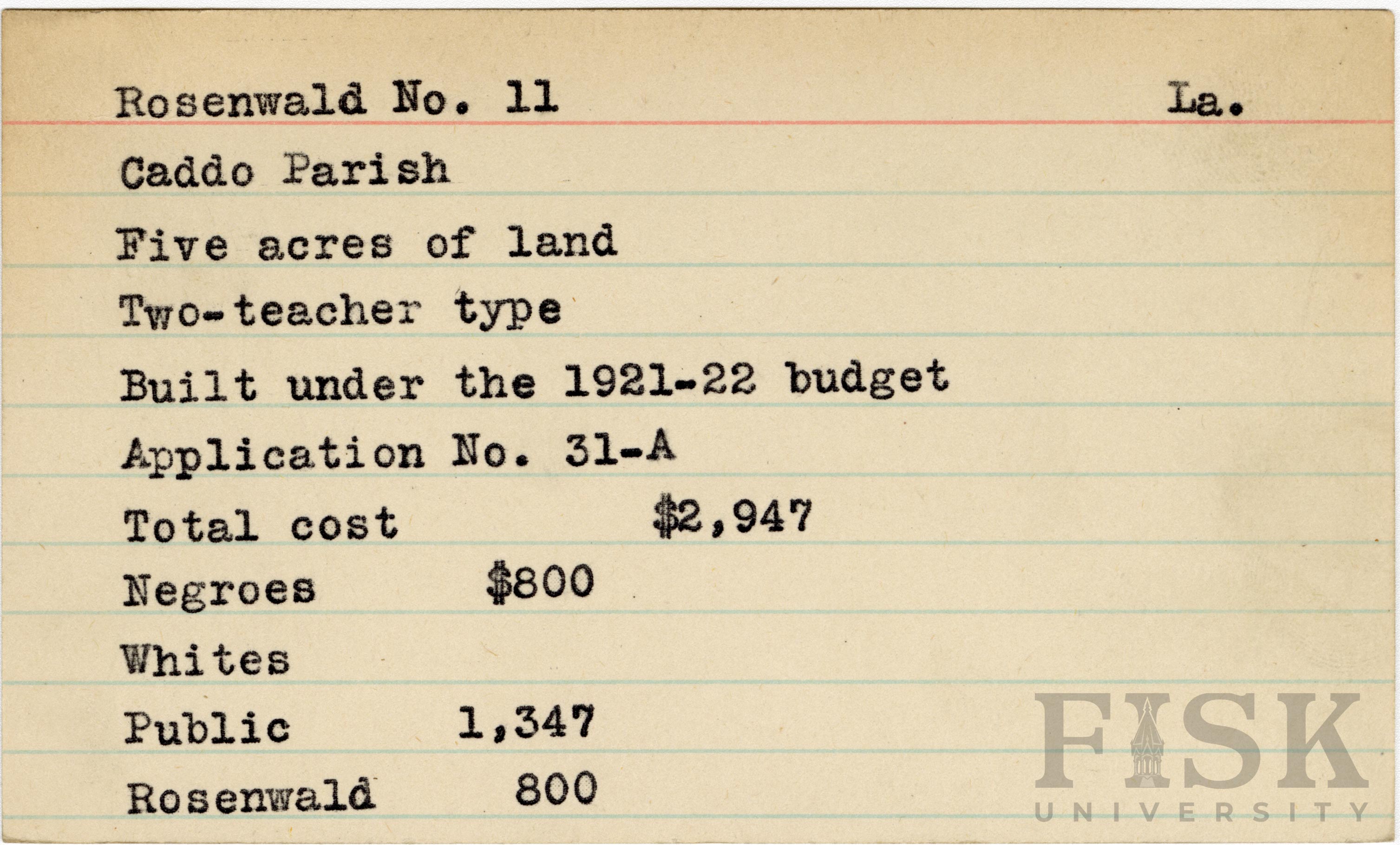 - School card from the Rosenwald Fund for Rosenwald School No. 11 in Caddo Parish, Louisiana