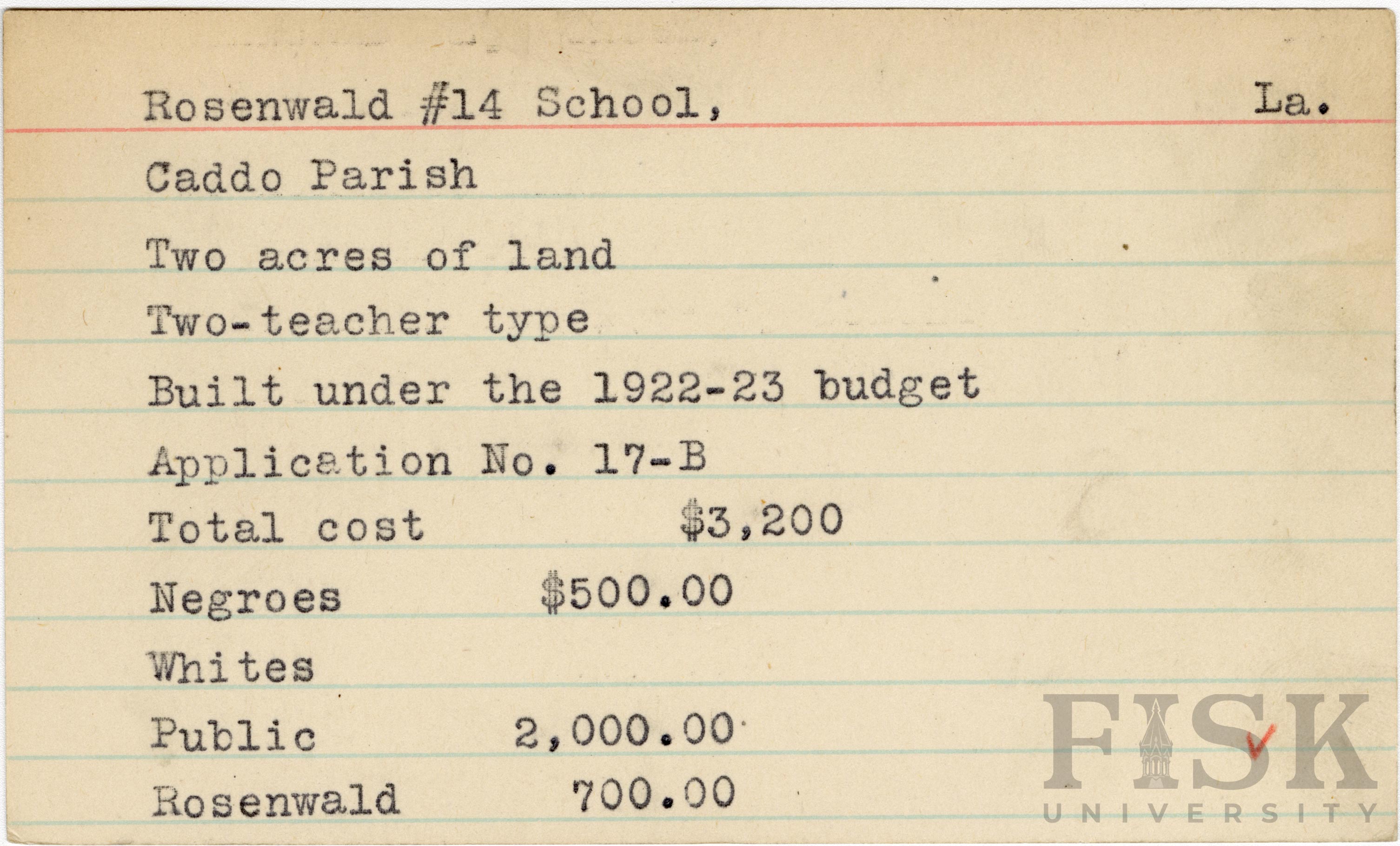 - School card from the Rosenwald Fund for Rosenwald School No. 14 in Caddo Parish, Louisiana