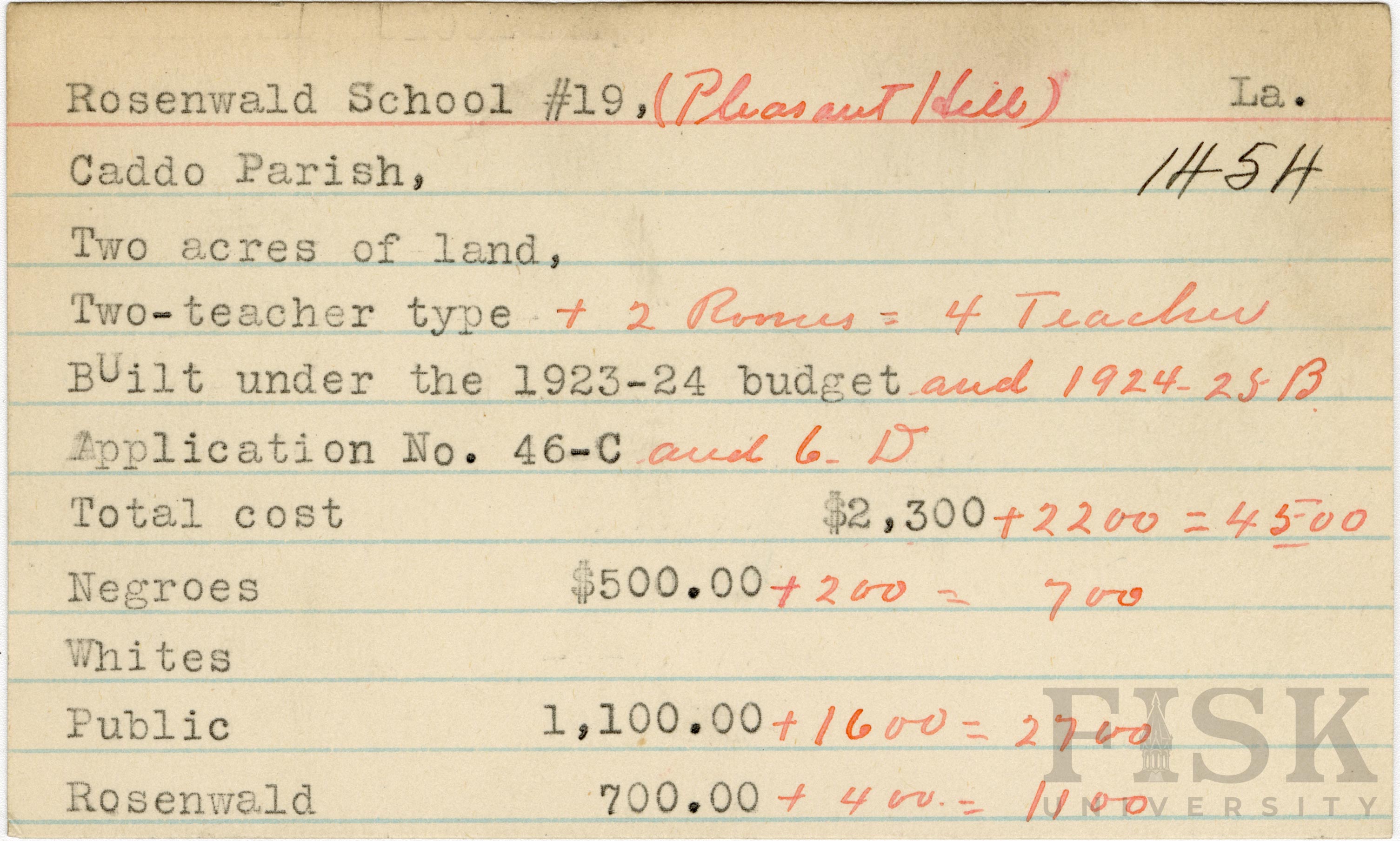 School card from the Rosenwald Fund for Rosenwald School No. 19 in Caddo Parish, Louisiana with handwritten additions to the teacher type, budget year, application number, and budget contribution sections