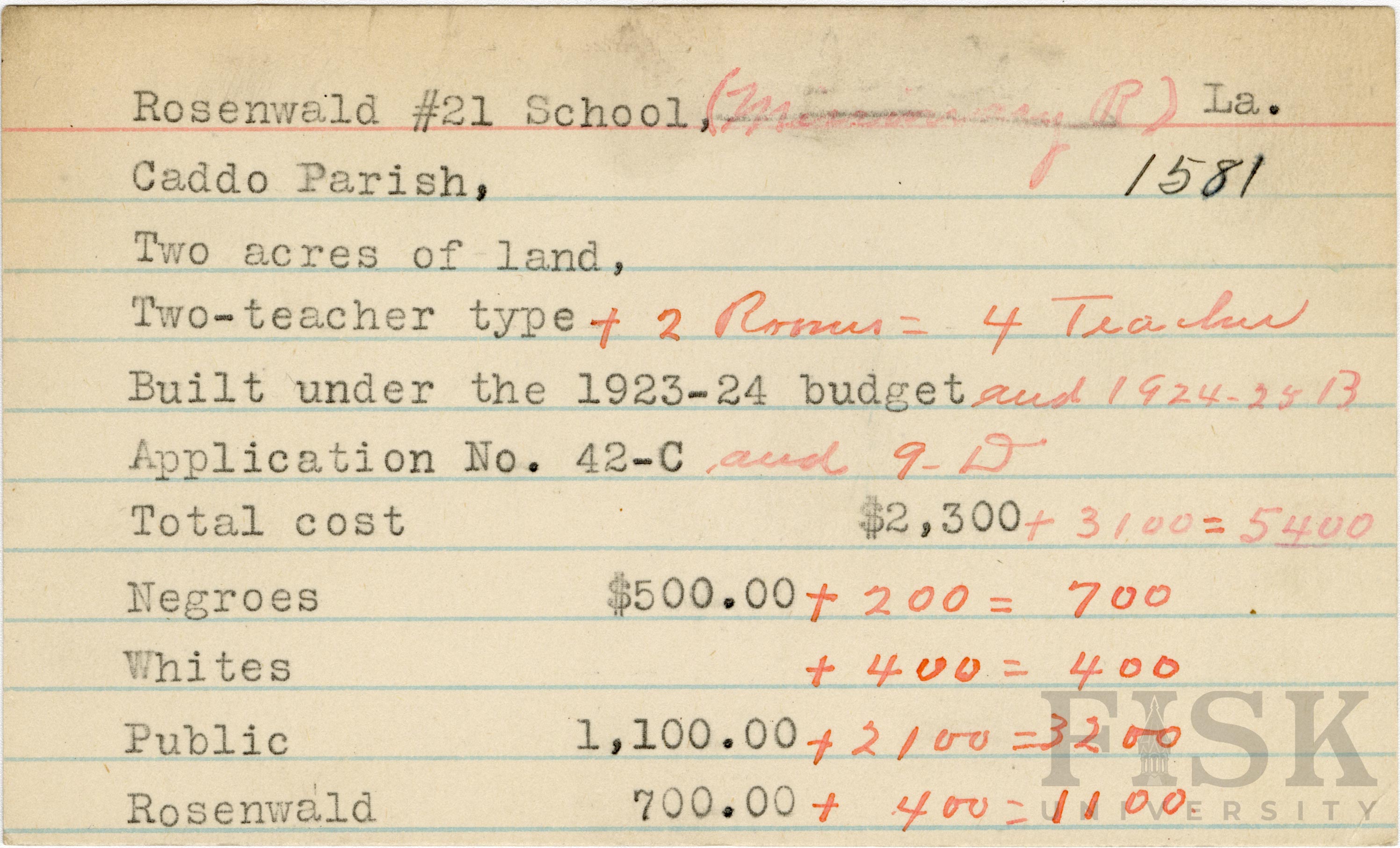 - School card from the Rosenwald Fund for Rosenwald School No. 21 with handwritten additions to the teacher type, budget year, application number, and budget contribution sections